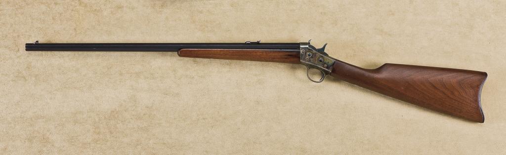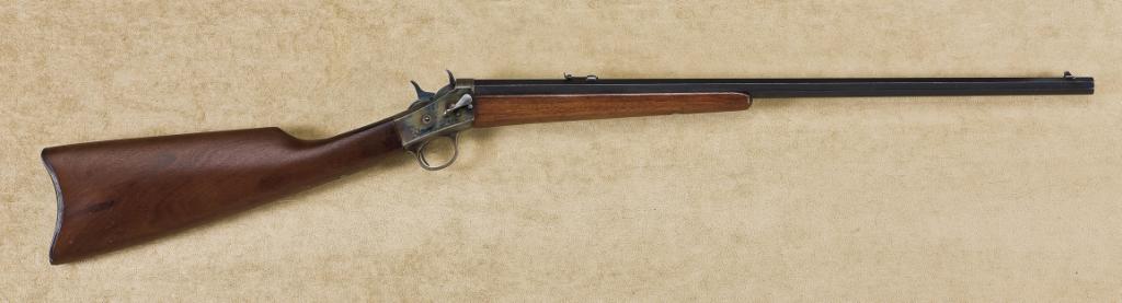 Remington No. 4 Rolling Block single shot rifle, 25-10 RF cal., 22” octagon barrel, blue and case hardened finish, wood stocks, #J256788. This diminutive gun is in overall fine condition showing approx. 98% original blue and case colors, fine bore, crisp action, sharp markings and excellent wood stocks; showing little use or handling. Est.: $750-$1,500.