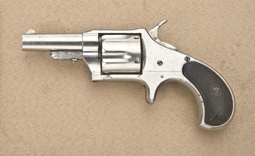 Remington No. 4 spur trigger revolver, .38 cal., 2-1/2” round barrel, nickel finish, checkered hard rubber grips, #NVSN. This gun is in overall excellent condition showing approx. 97% original finish, fine bore, crisp action and markings, very good to fine grips with some high point wear. A really nice example of this model pocket revolver. Est.: $300-$600.