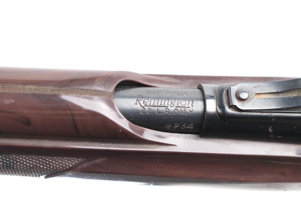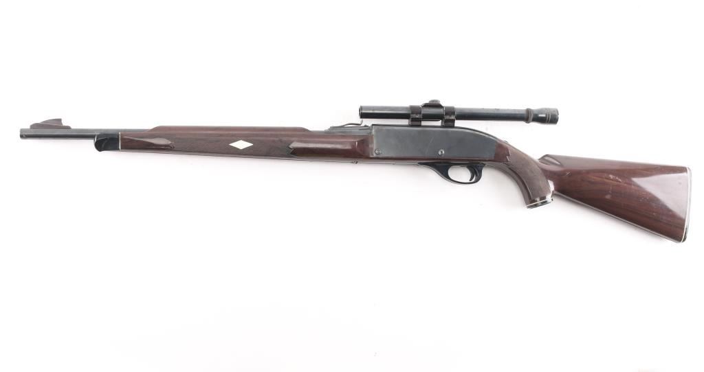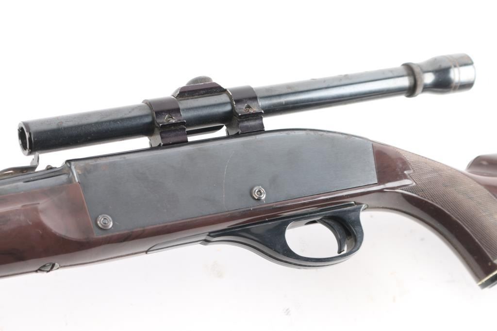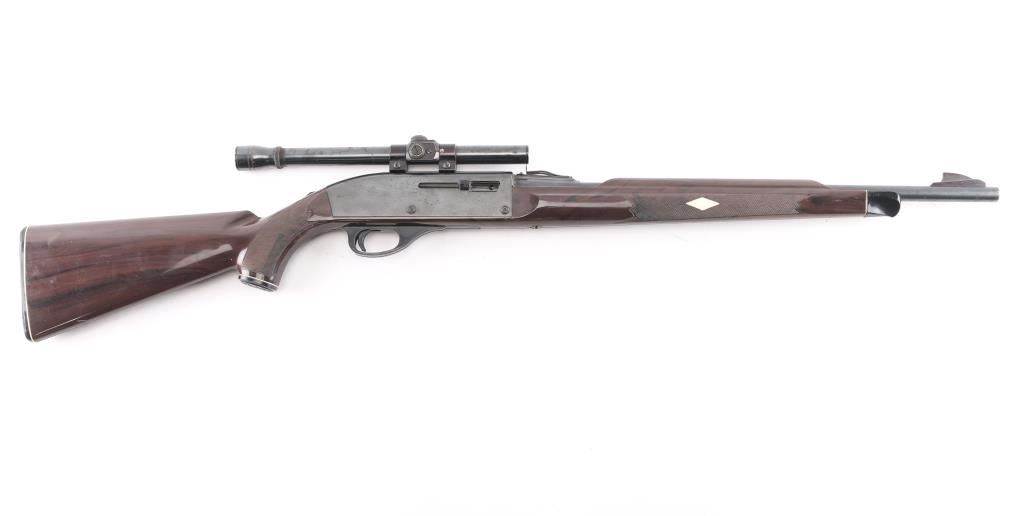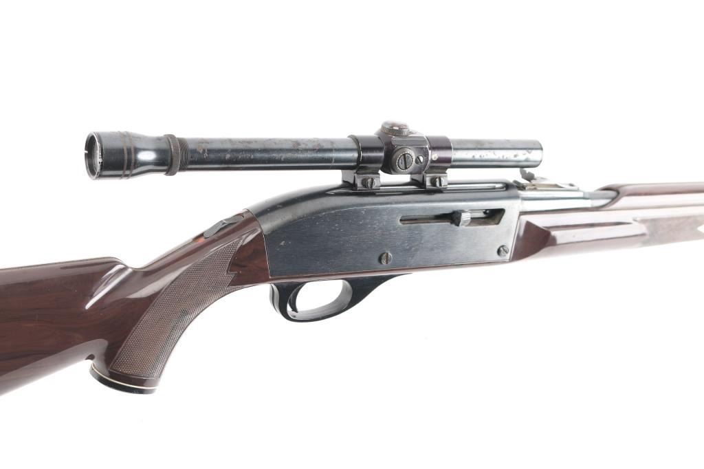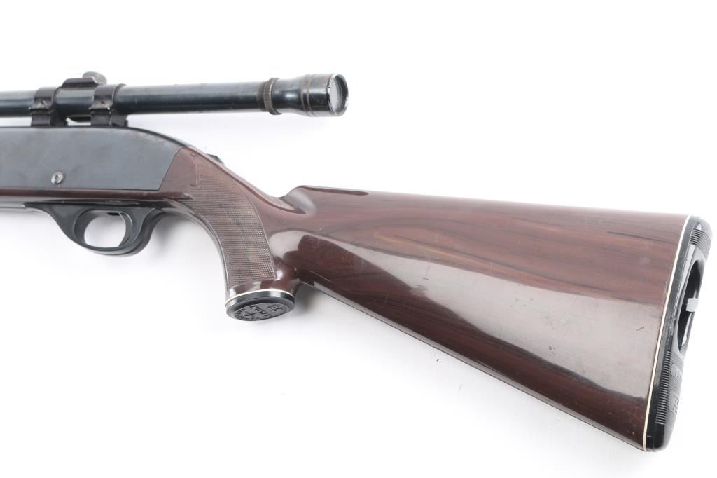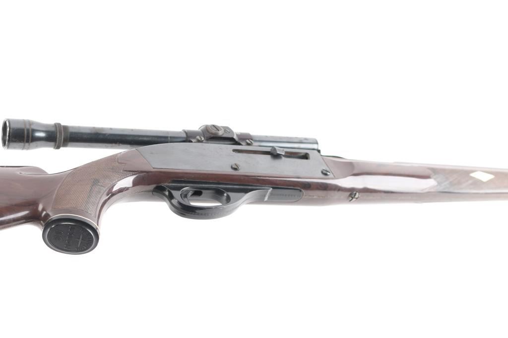 Vintage semiautomatic rimfire rifle circa 1967, features blued finish, brown nylon/polymer stock, 19.5" barrel, large blade front sight, adjustable rear sights, missing elevator, manual safety, tube magazine in butt, grooved trigger, plastic trigger guard and integral scope base machined into receiver. Mounted with a unmarked 4x scope, clear optics. Bore is very good and bright. 75% finish with scattered patches of pitting including the scope Stock looks good with little to no cracks/scratches, grip cap is intact.