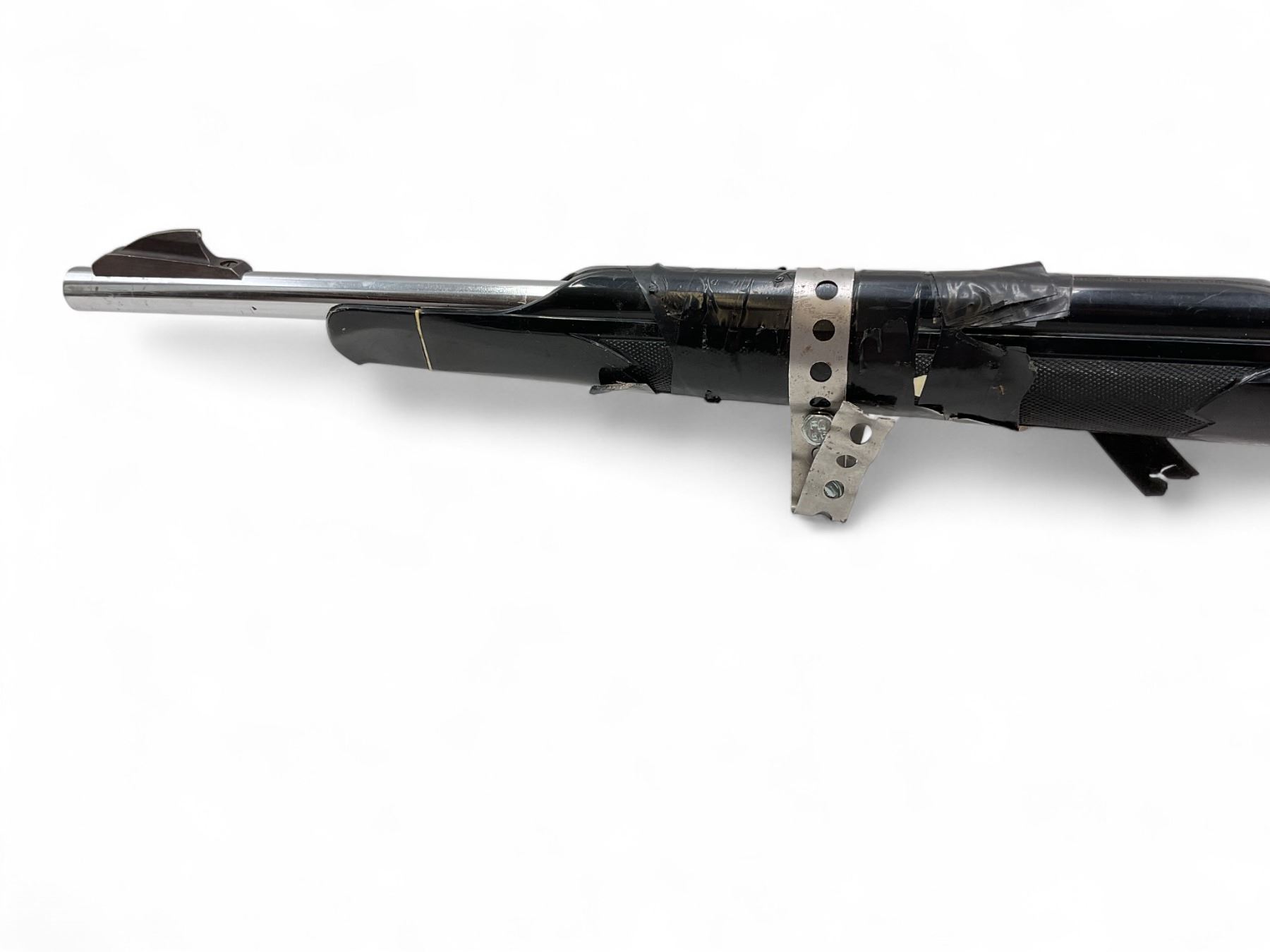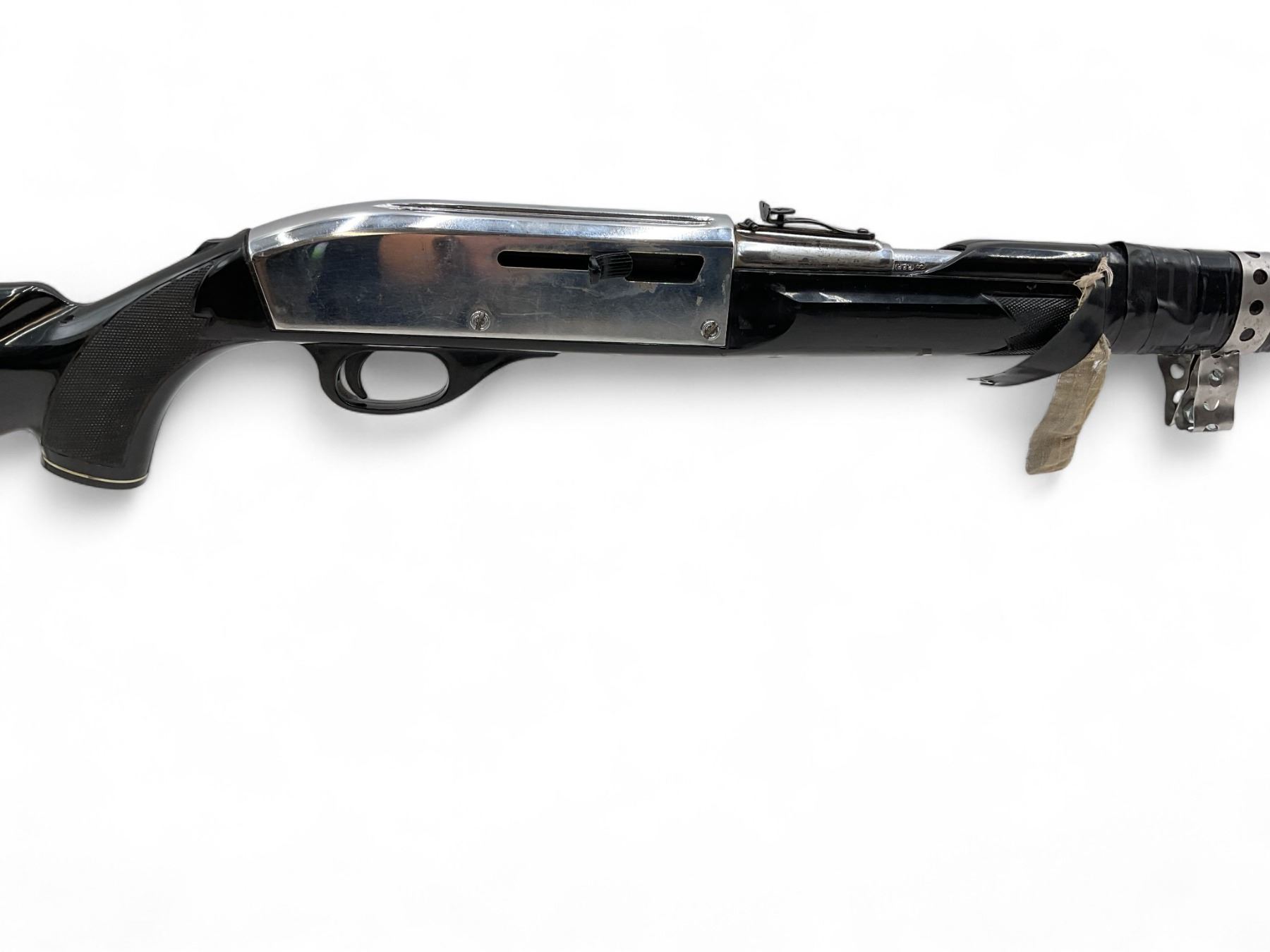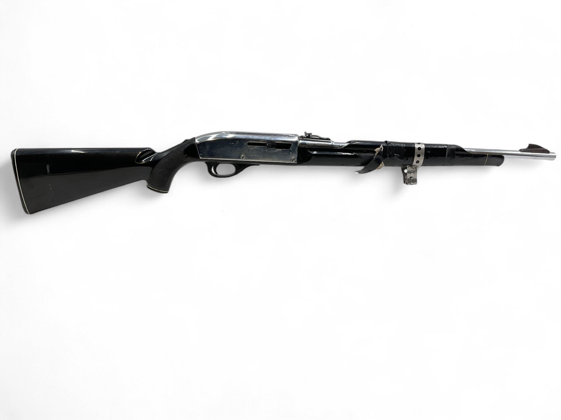 Remington Nylon 66 Semi Auto Rifle .22LR 19.5" Chrome Barrel And Chrome Receiver Black Stock. Internal magazine. Factory open sights. Forend taped and held together with all-round strapping and rags. Rear stock taped and wrapped with rags. May be missing pieces. This is a non-restricted firearm.