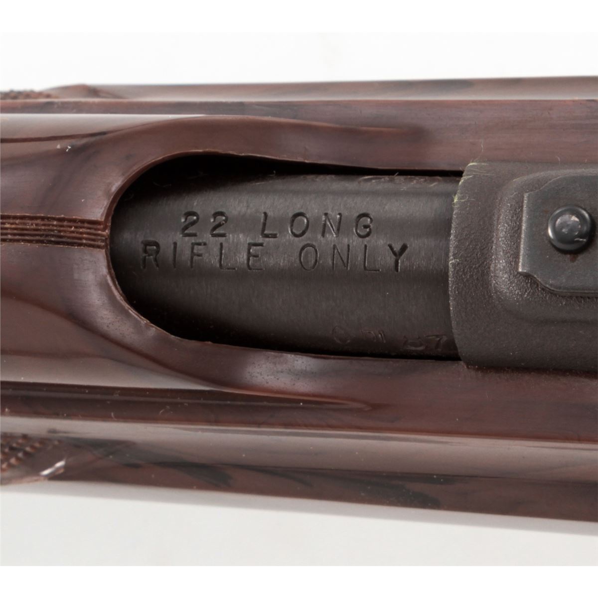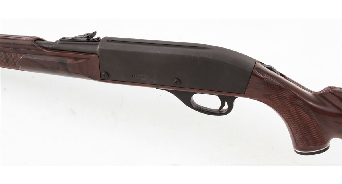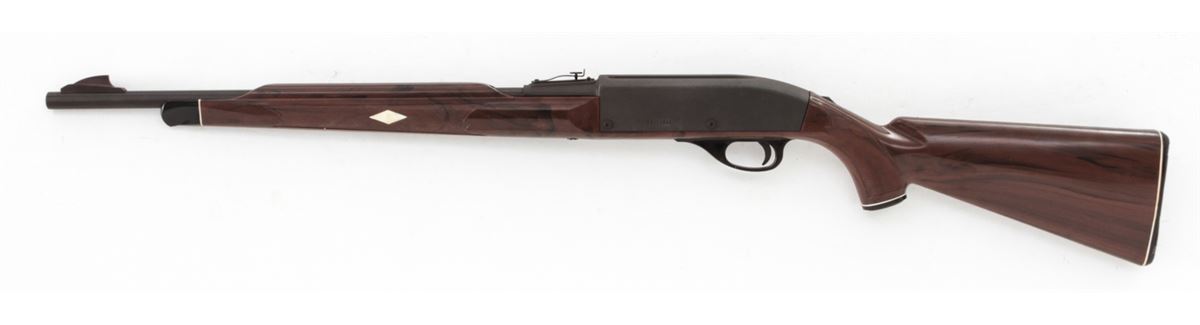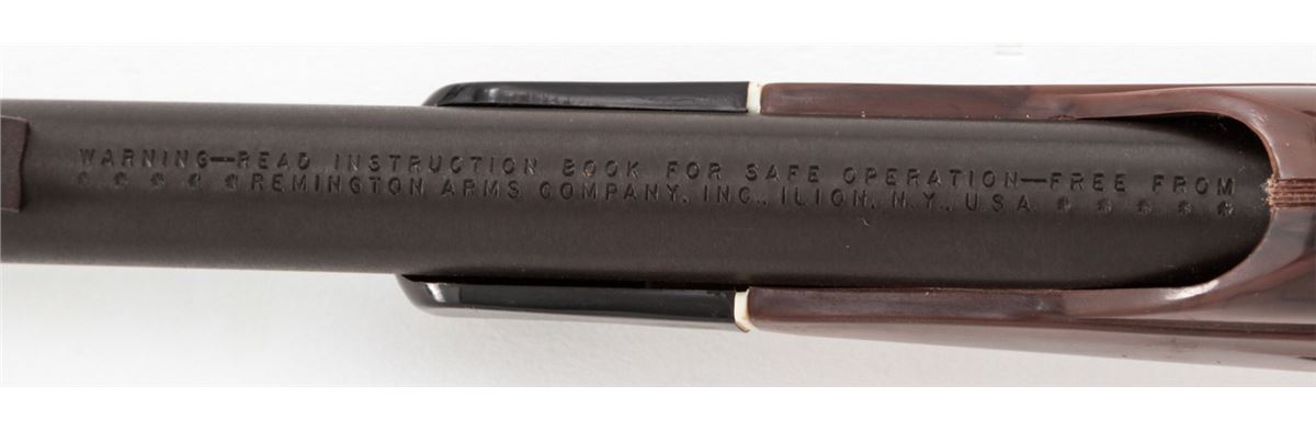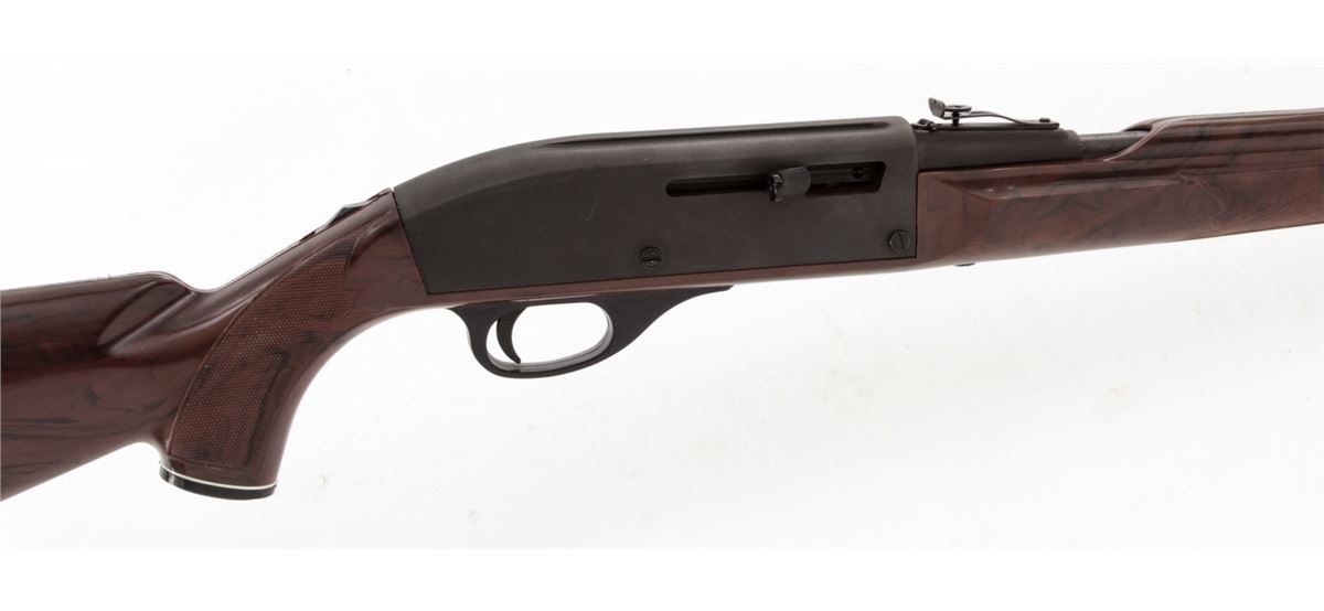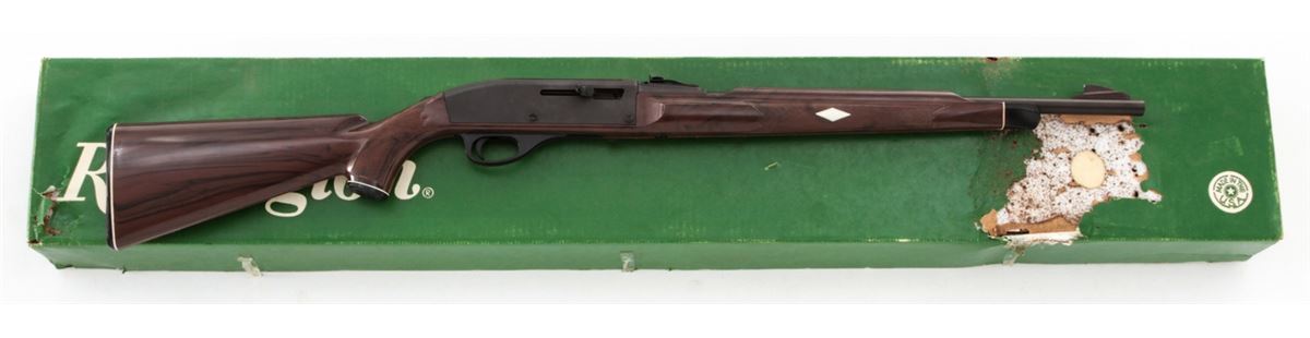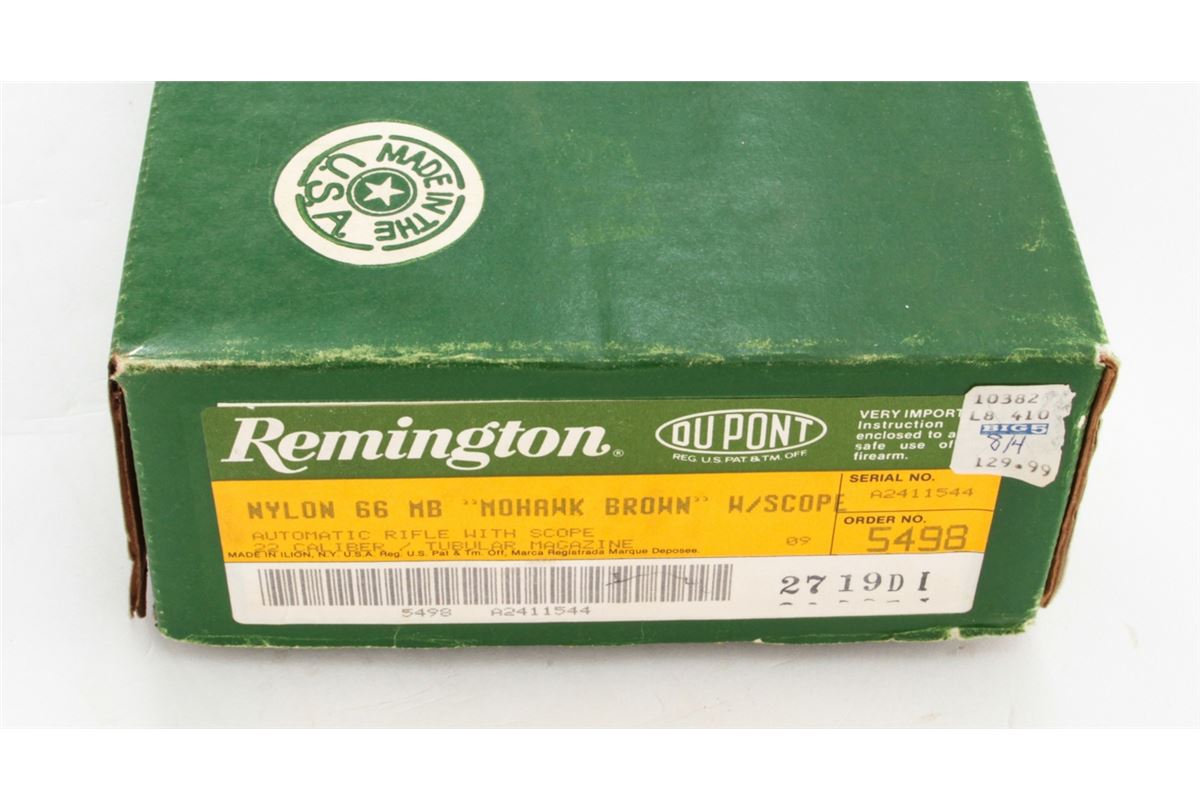 Remington Nylon 66 Semi-Automatic Rifle, #A2411544, .22 LR cal., 19-5/8'' barrel, black finish, Mohawk brown Zytel plastic stock, Remington buttplate, adjustable rear sight, in original box with matching end label. Condition is excellent overall with light marks from handling. Receiver with a few additional moderate scratches; front sight with mild surface rust that should clean easily. Action is crisp, bore is bright. Box with damage to the lid. Est.: $250-$450. (Modern)