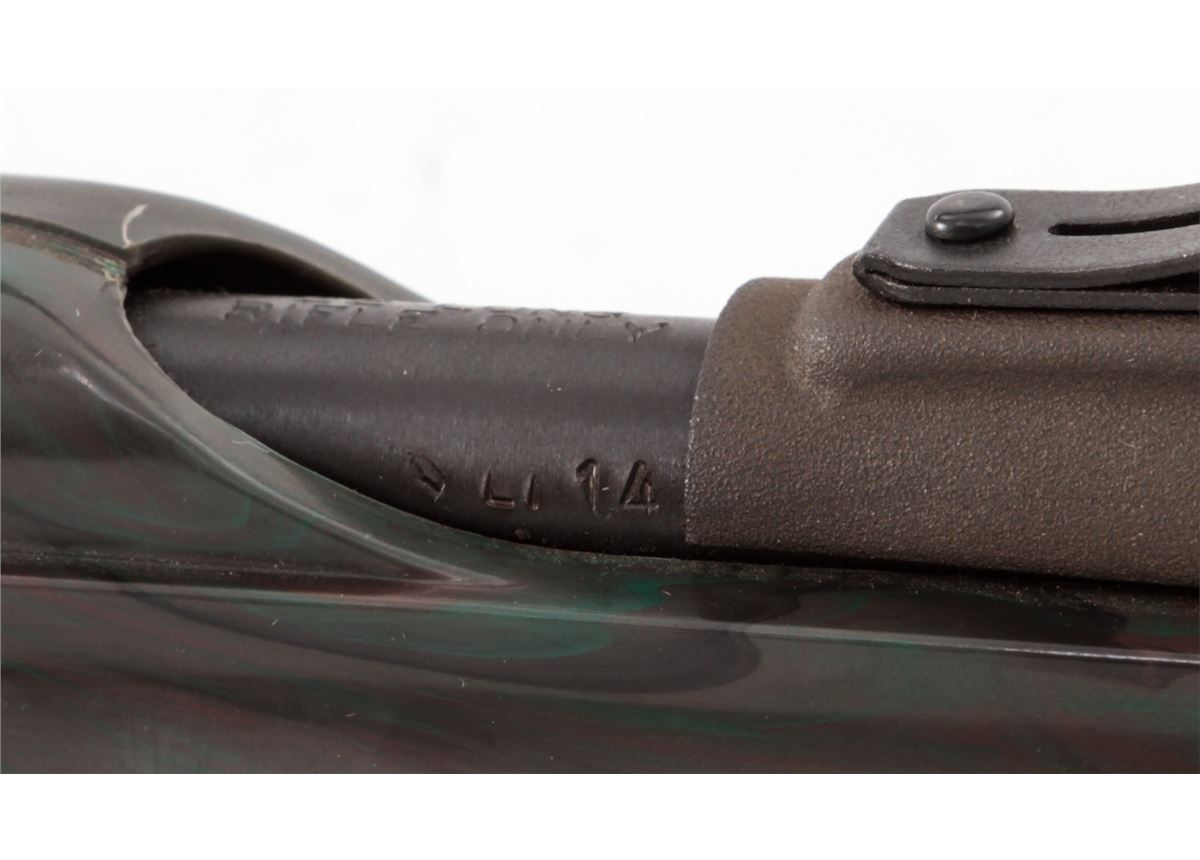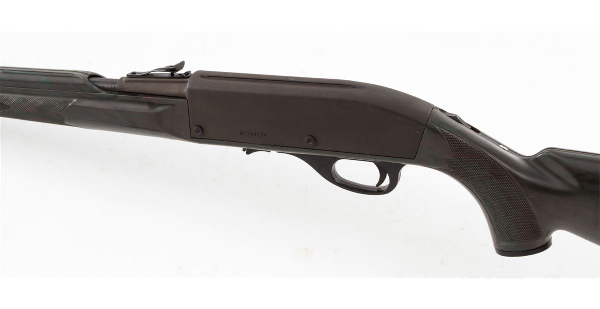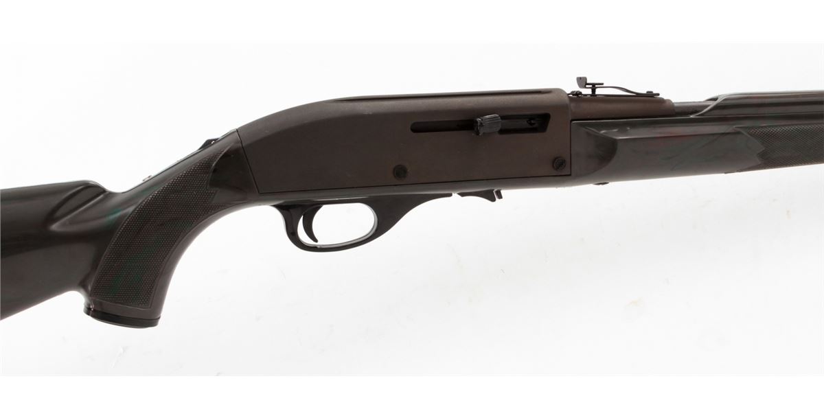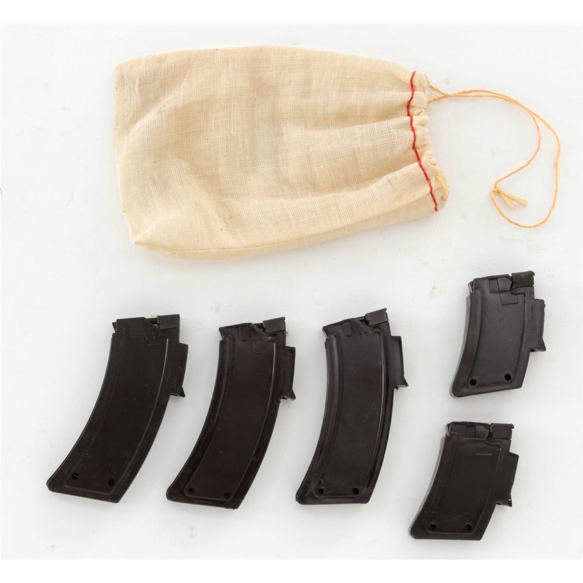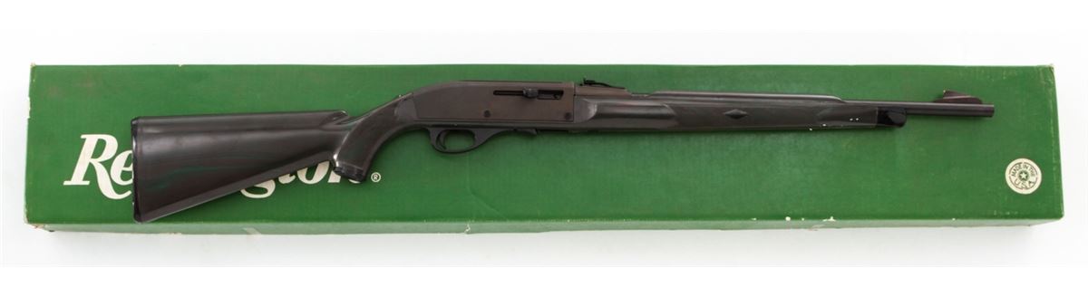 Remington Nylon Apache 77 Semi-Automatic Rifle, #A2380734, .22 LR cal., 19-5/8'' blue barrel, matte finish receiver, dark olive green Zytel plastic stock, Remington buttplate, adjustable rear sight, with three (3) ten-round and two (2) five-round magazines, and the original box with matching end label. Mfg'd 1987-1989. Condition is excellent overall, appearing near new. Stock with light marks from handling, front sight with very mild surface rust that should clean easily. Action is crisp, bore is bright. Est.: $200-$400. (Modern)