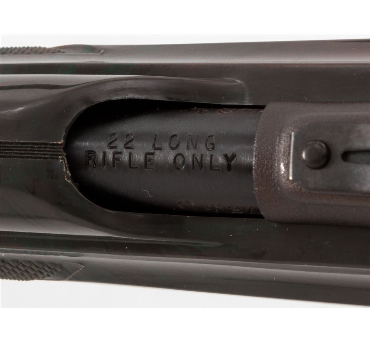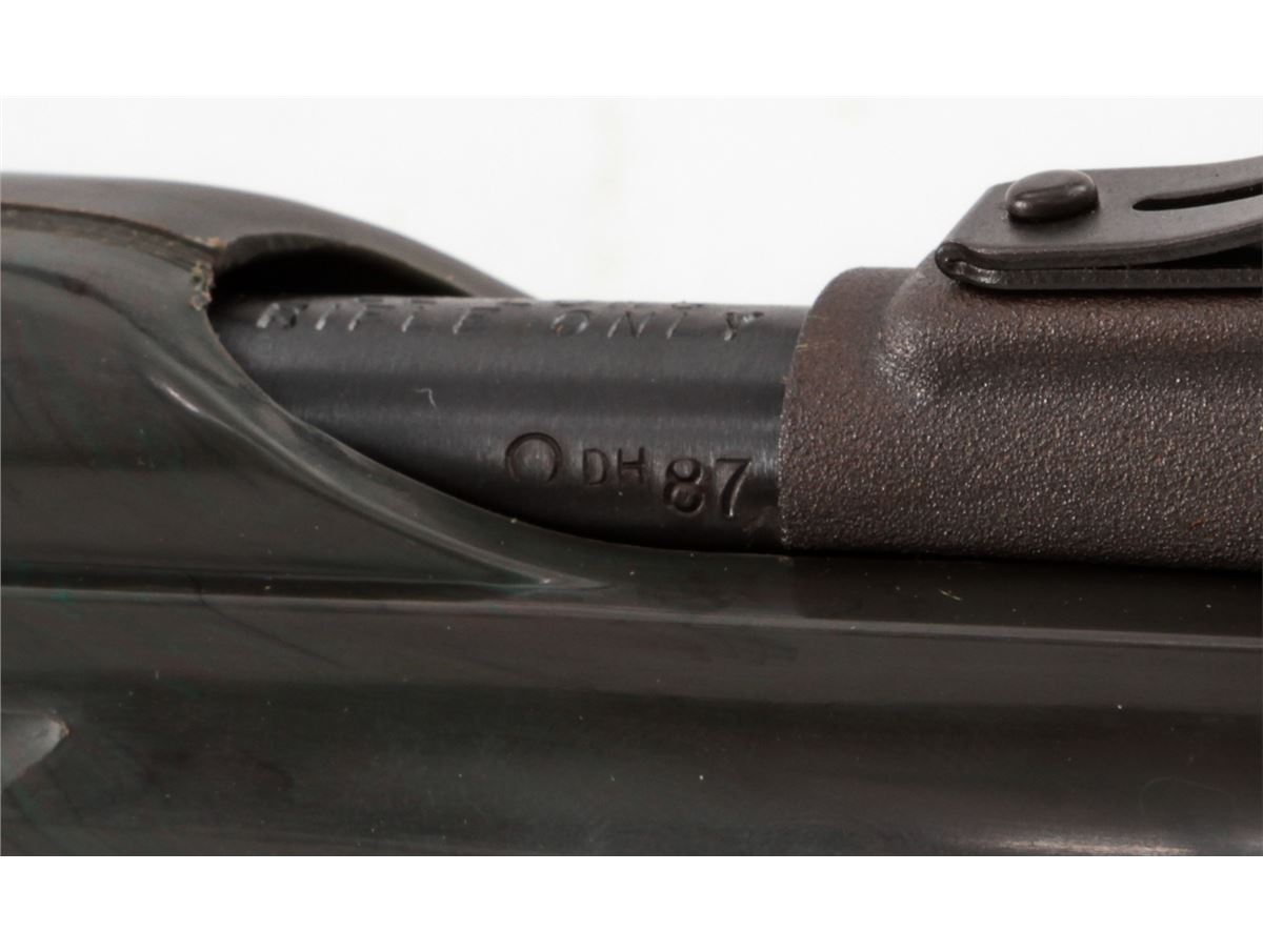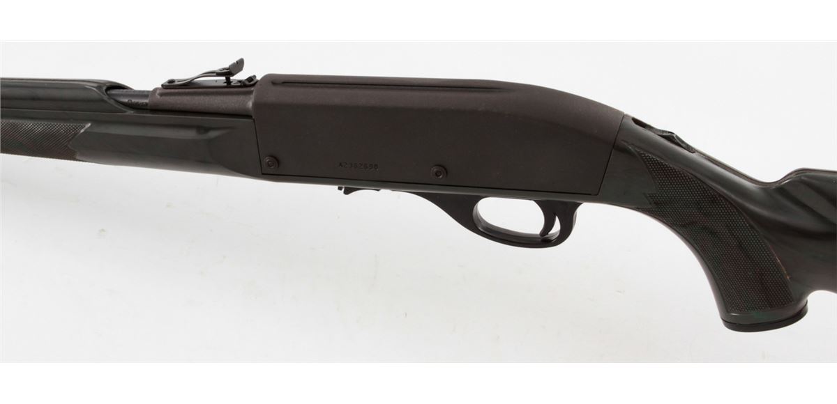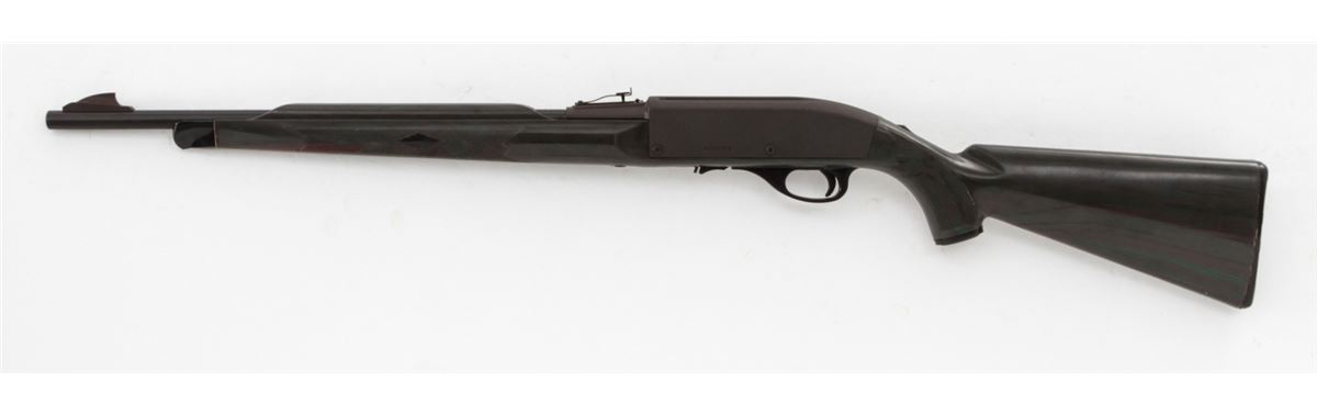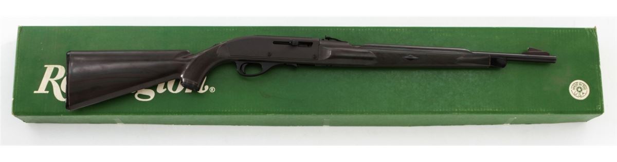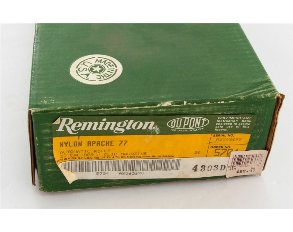 Remington Nylon Apache 77 Semi-Automatic Rifle, #A2362698, .22 LR cal., 19-5/8'' blue barrel, matte finish receiver, dark olive green Zytel plastic stock, Remington buttplate, adjustable rear sight, with one magazine, in original box with matching end label and original owner's manual. Mfg'd 1987-1989. Condition is excellent overall, appearing near new, stock with light marks from handling, front sight with mild surface rust that should clean easily. Action is crisp, bore is bright. Est.: $200-$400. (Modern)