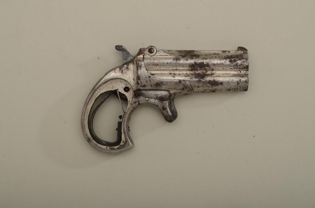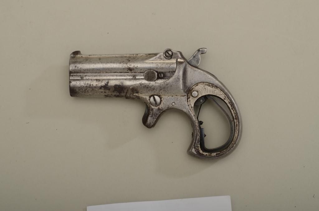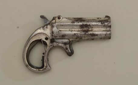 Remington O/U Derringer, .41 cal., 3” barrels, nickel finish, missing grips, #2. This gun is in overall fair to good condition showing traces of nickel finish with balance gone to a grey patina, one slight crack onthe lower left side hinge; spots of erosion in bores, good action and barrel address; some scattered spots of erosion on barrel and frame; interesting single digit number on underside of barrel and on frame. Est.:$250-$500.