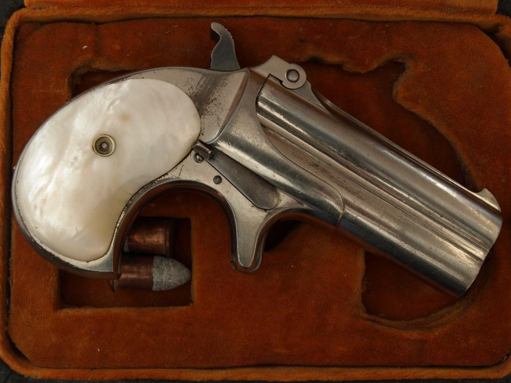 with period lined and fitted case. Early Derringer showing fine overall condition, nickel finish, mother of pearl grips, excellent action and bores. NO FFL required.