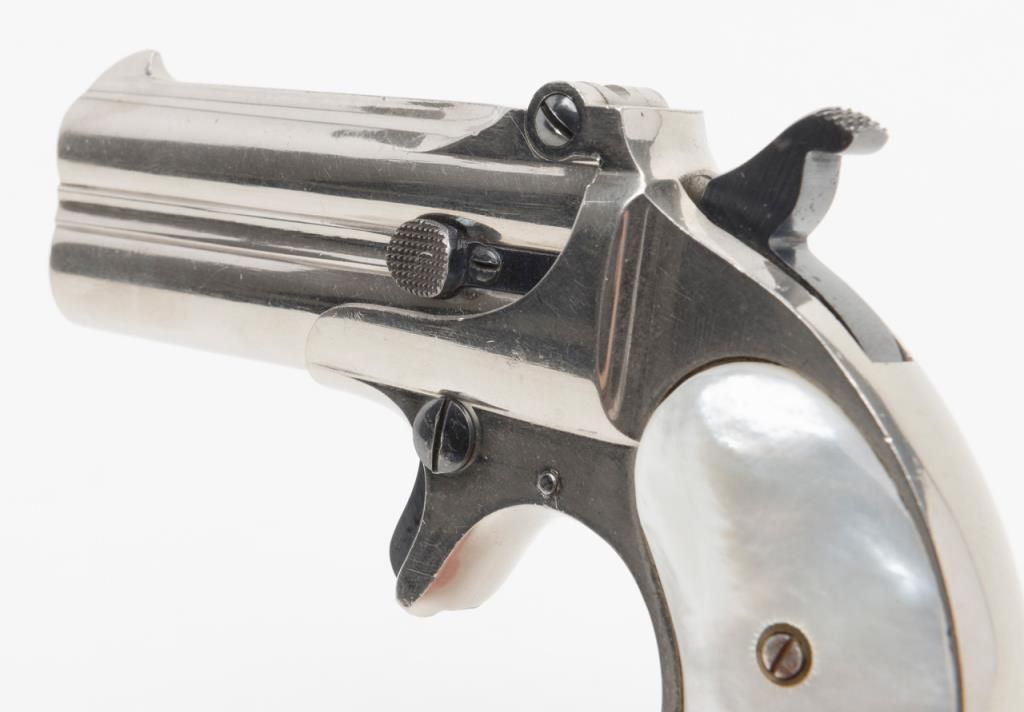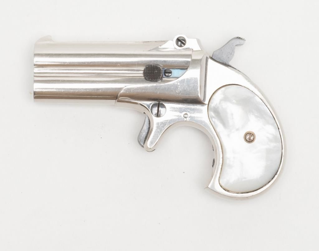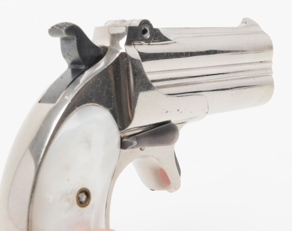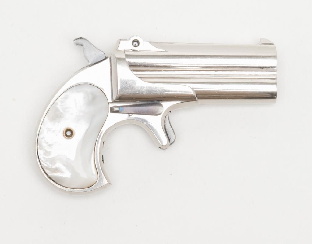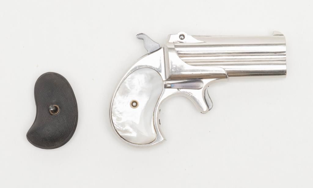 Remington O/U Double Derringer, .41 cal., 2nd Type with 1-line barrel address, 3” barrels, in overall fine to excellent original condition with 97%-99% original bright nickel finish, some slight normal aging, bright blue on small parts andscrews (at least 90%); hinges are unbroken, beautiful old iridescent pearl grips (accompanied by original pair of fine checkered hard rubber grips); tight action; truly a 9.7 or 9.8 on a scale of 1 to 10 and a candidate for placement ina factory cardboard box! (Antique) Est.: $2,500-$3,500.