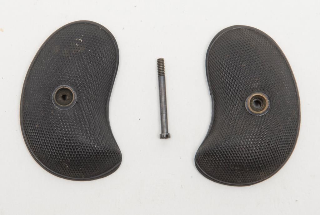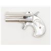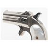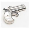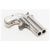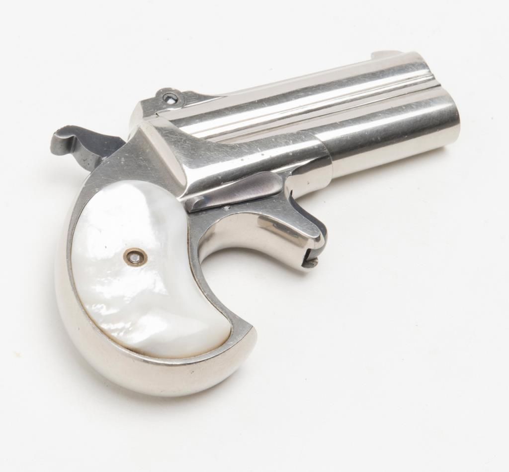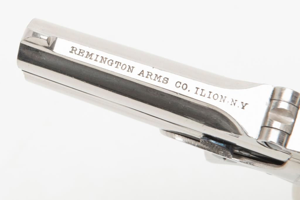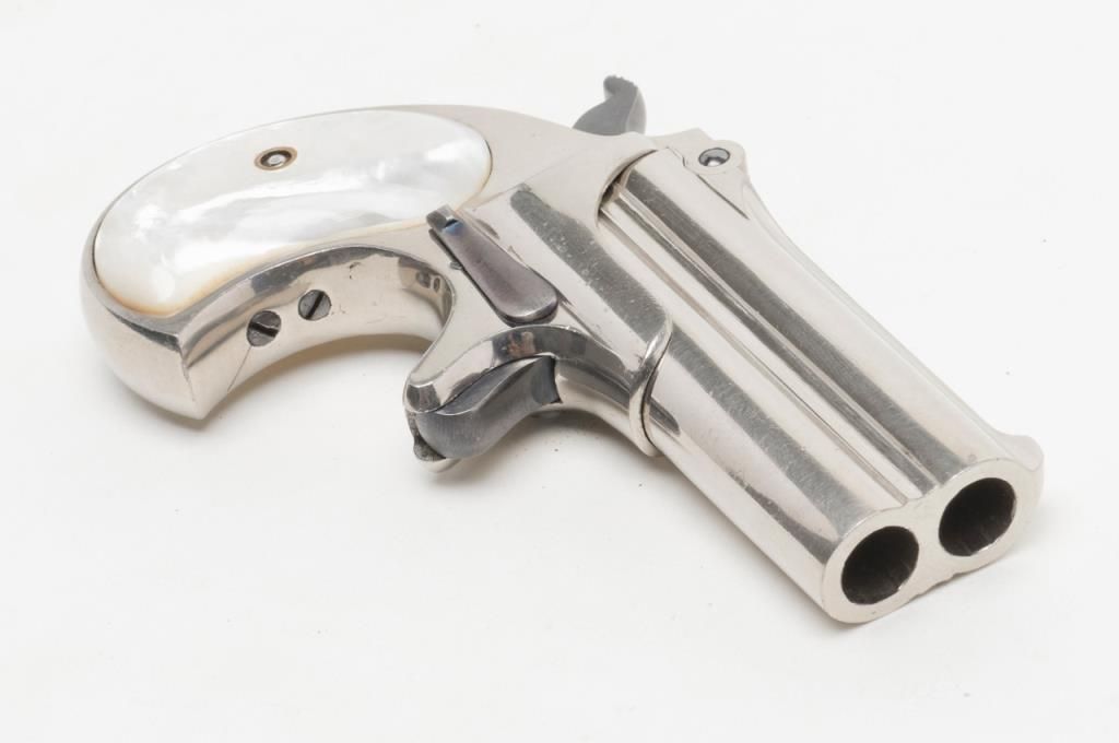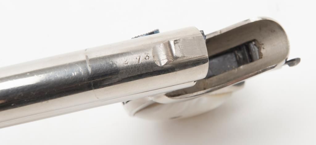 Remington O/U Double Derringer, .41 cal., 2nd Type with 1-line barrel address, 3” barrels, in overall fine to excellent original condition with 97%-99% original bright nickel finish, some slight normal aging, bright blue on small parts andscrews (at least 90%); hinges are unbroken, beautiful old iridescent pearl grips (accompanied by original pair of fine checkered hard rubber grips); tight action; truly a 9.7 or 9.8 on a scale of 1 to 10 and a candidate for placement ina factory cardboard box! (Antique) Est.: $2,500-$3,500.