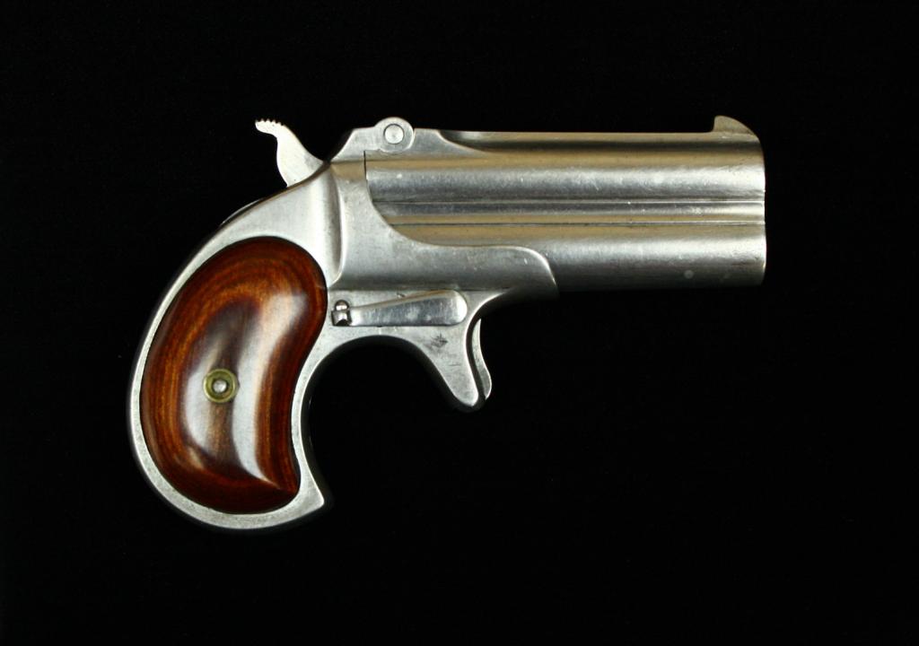 Remington O/U derringer, .41 cal., 3” barrels, #L96959. This gun is in overall very good condition showing a light grey patina on metal surfaces, good bore, markings and action; replaced later smooth wood grips that fit the gun nicely. Est.: $200-$400.