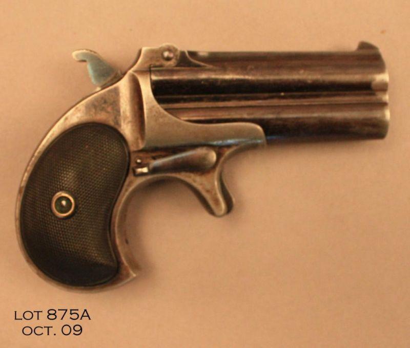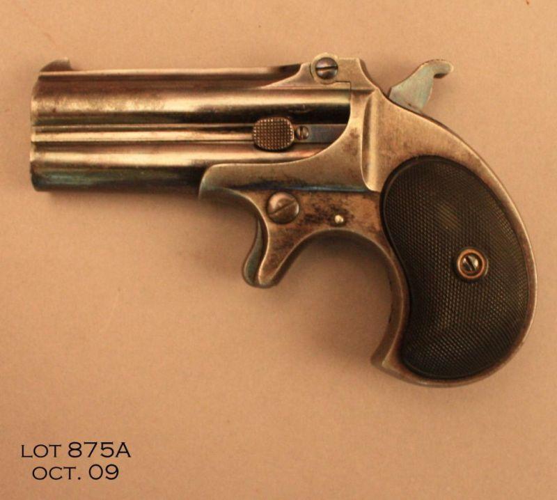 Remington O/U derringer, .41 cal., one line slant barrel address, blue finish, checkered black hard rubber grips, #66. This gun is in overall very good condition showing approx. 80% original blue on barrels, traces of blue in protected areas offrame, very good bore, action, markings and grips. Est.: $500-$1,000.