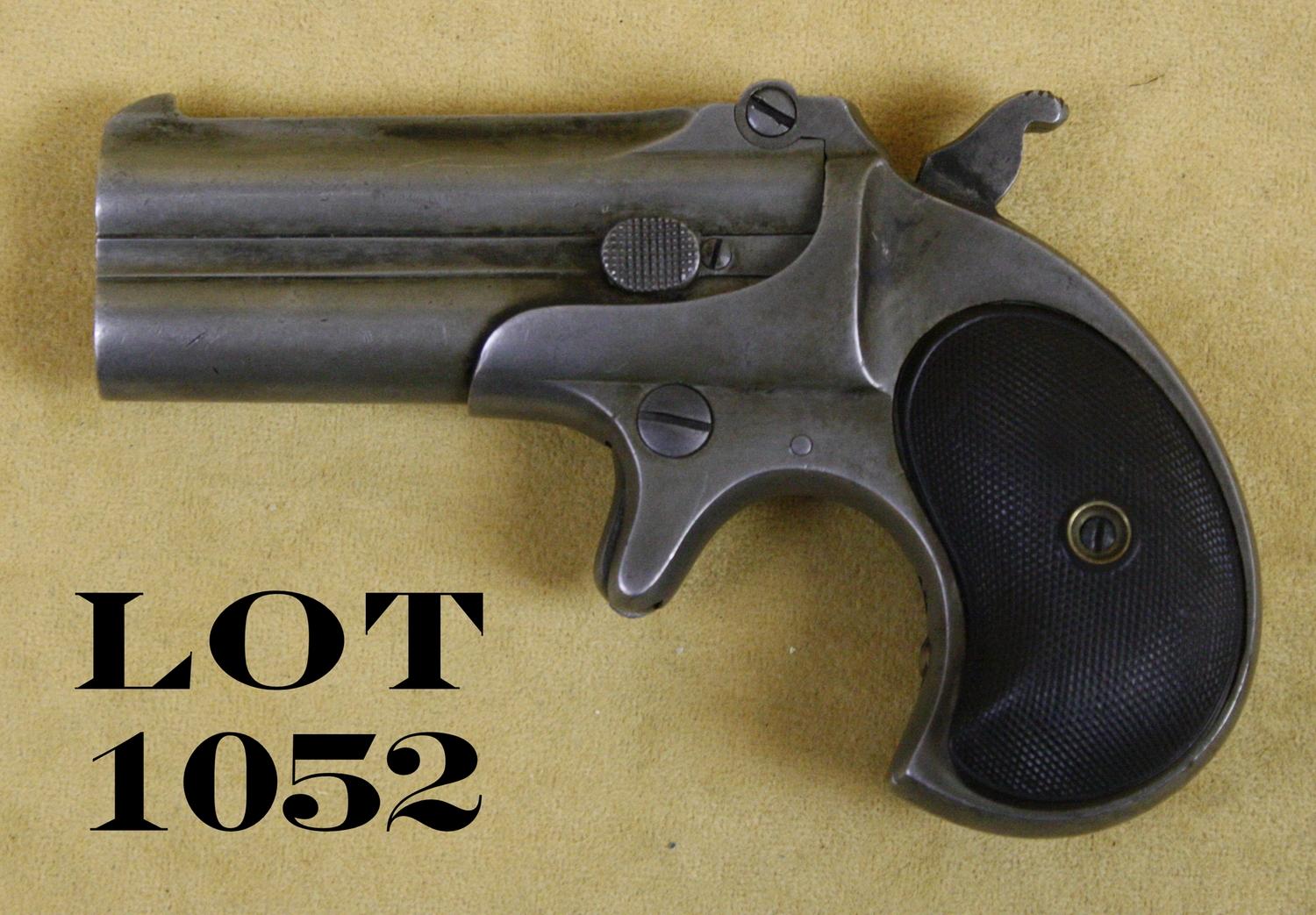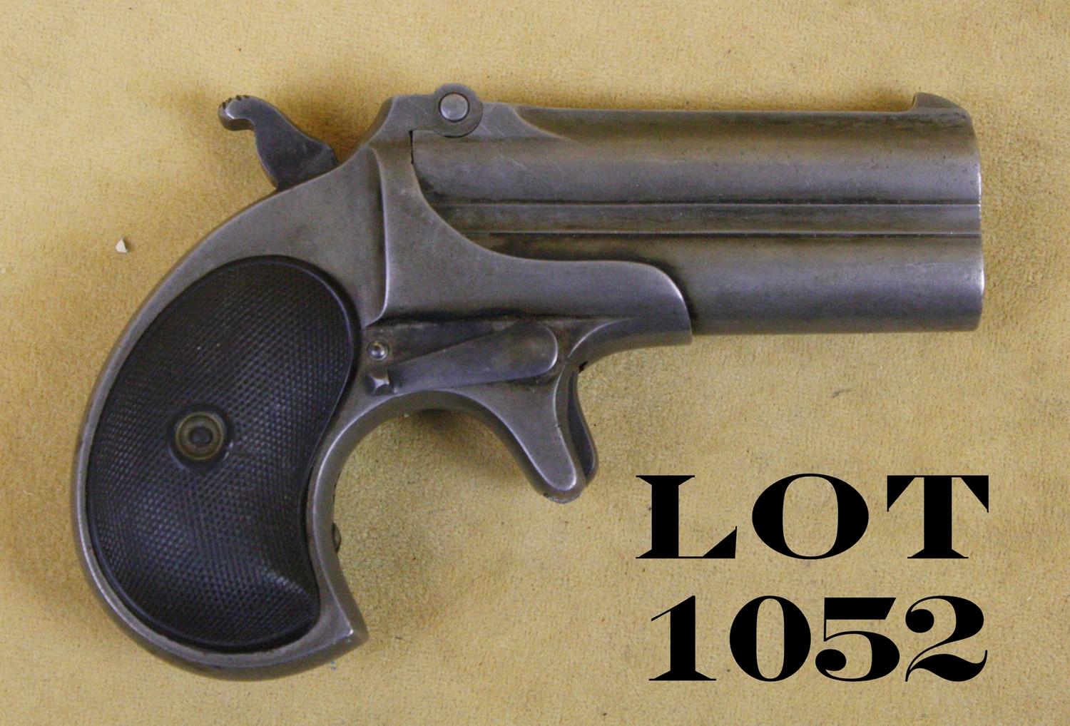 Remington O/U last series .41 caliber rimfire derringer with UMC barrel address, traces of original blue, hard rubber grips, #L92031. The derringer remains in good condition with good edges and markings, traces of blue, good action, good grips, bore is slightly rough; must be registered; made post-1900. Est.: $250-$500.