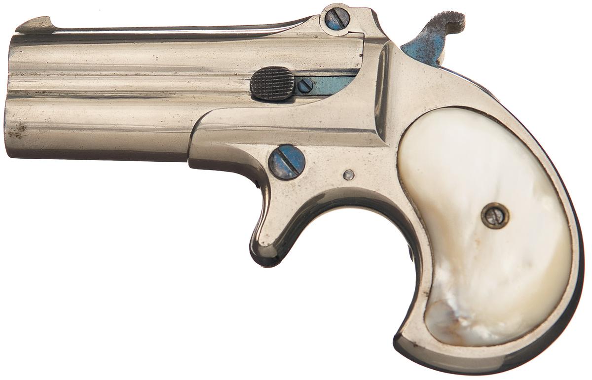 This is an example of a Type II, or Model Number 3, derringer manufactured from 1888 to 1911. The derringer has the manual extractor and is marked " REMINGTON ARMS CO., ILION, N.." on the barrel rib. Nickel finished with niter blue hammer, extractor, barrel release, and spur trigger. Matching numbers on frame and barrels. Fitted with pearl grips.