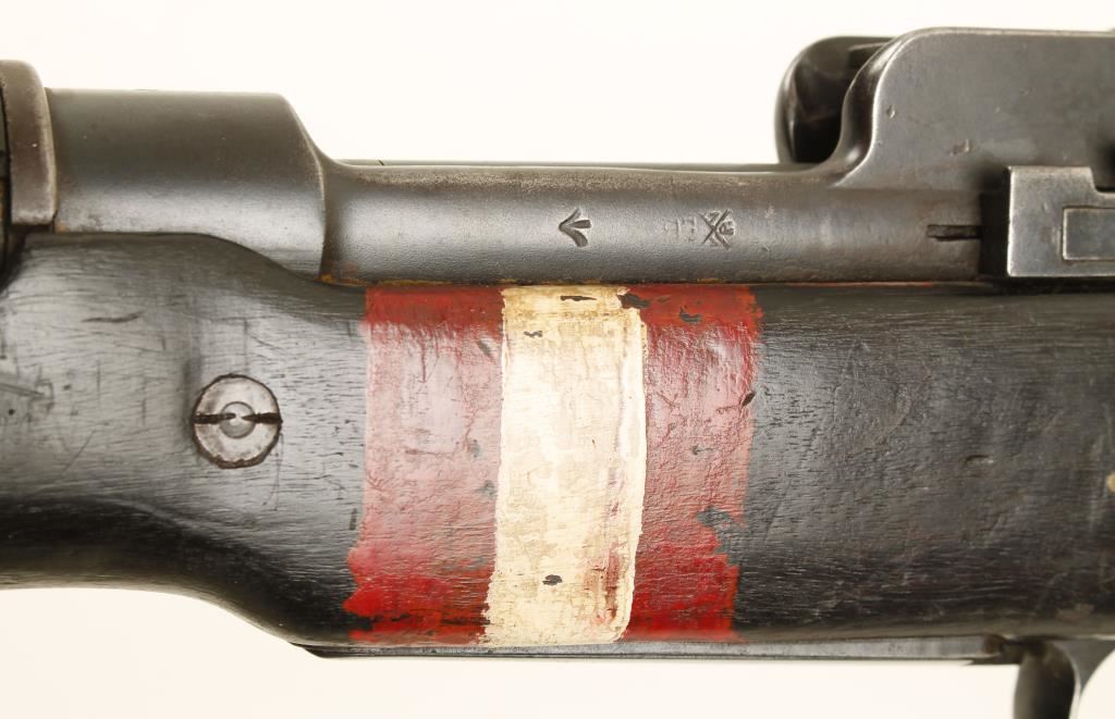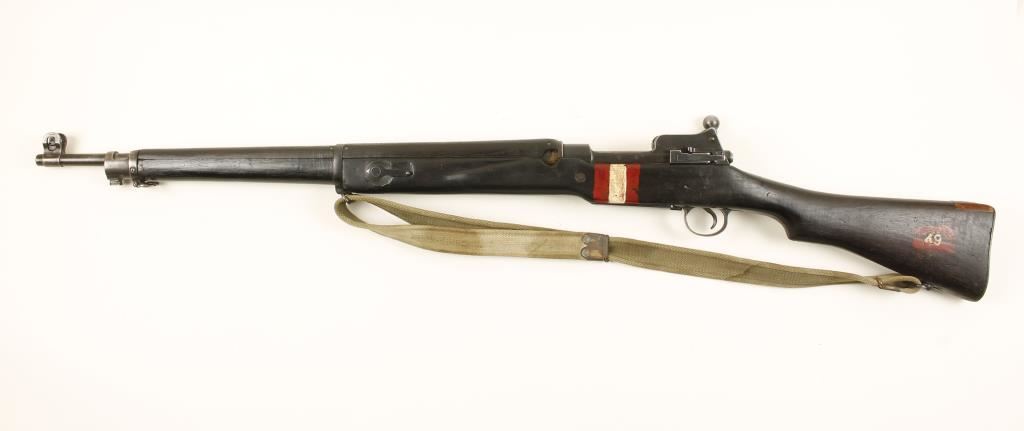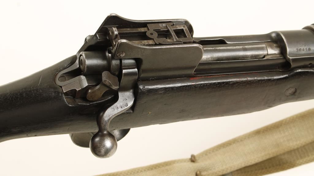 Blued bolt-action military rifle made by Remington for Britain. Stamped with "Broad Arrow" British military proof. Has volley sights. Barrel is 26" long. Bluing has edge wear and exposed wear and a few dings. Stock is almost black with wear, dings and scratches. There is a filler piece of wood at the heel of the butt. The butt plate has edge and contact point wear with dings and a trapdoor holding a pull-through jig. Bolt number matches receiver. Stock has red and white bands of paint by receiver. On stock there is a red "B" with white "49" on left and on right is a ref "F". There is one, maybe 2. wood plug on the right side as well. Bore is frosty with good rifling. Includes a web sling stamped "TR & Sons 1947". Condition is good. *Modern Firearm*