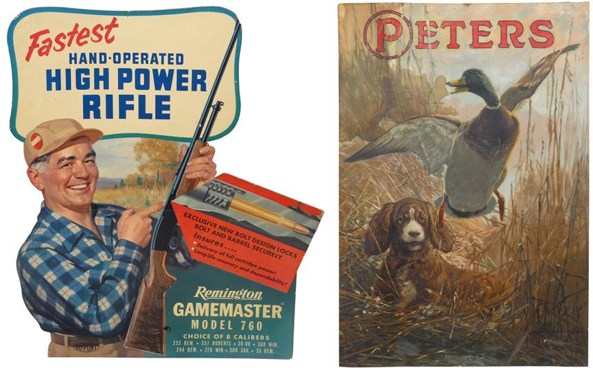 Remington & Peters signs (2); Remington High Power Rifle die cut cdbd sign w/easelback, shows hunter w/his Gamemaster Model 760, VG cond w/some edge wear, reinforced on reverse side at fold line, 25"H x 21"W & Peters Cartridge litho on paper by Lynn Bouge-Hunt, great dog & duck hunting scene, Good cond w/moisture stain in upper LH section, 20"H x 13.5"W.