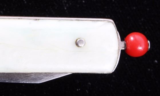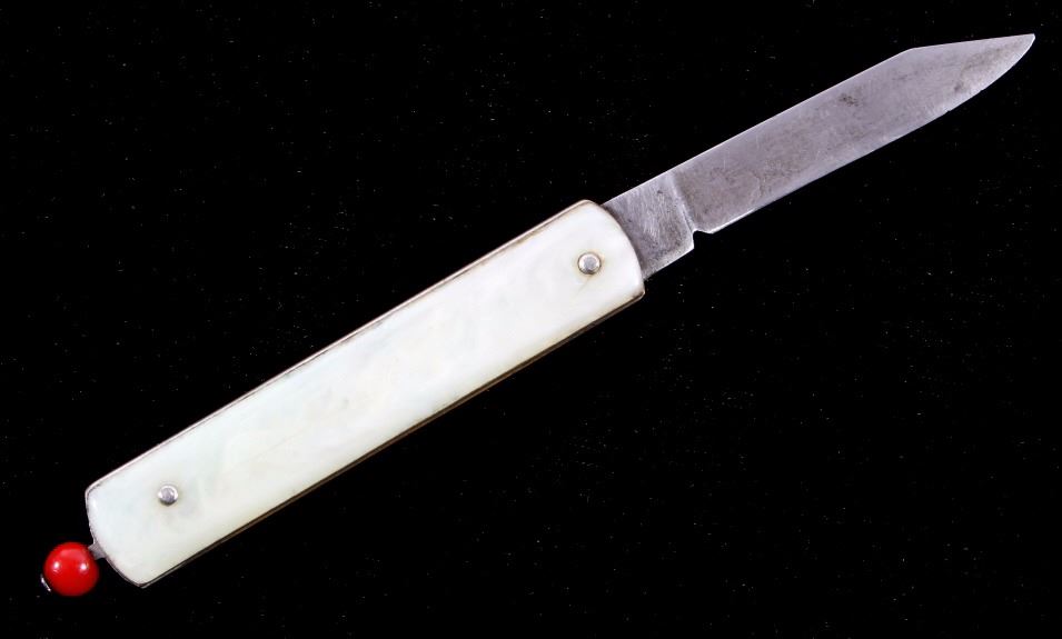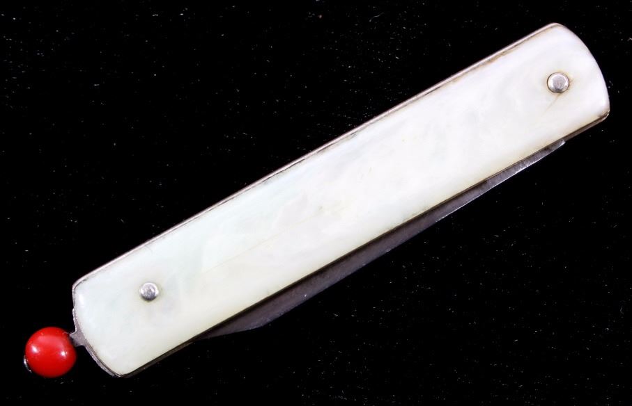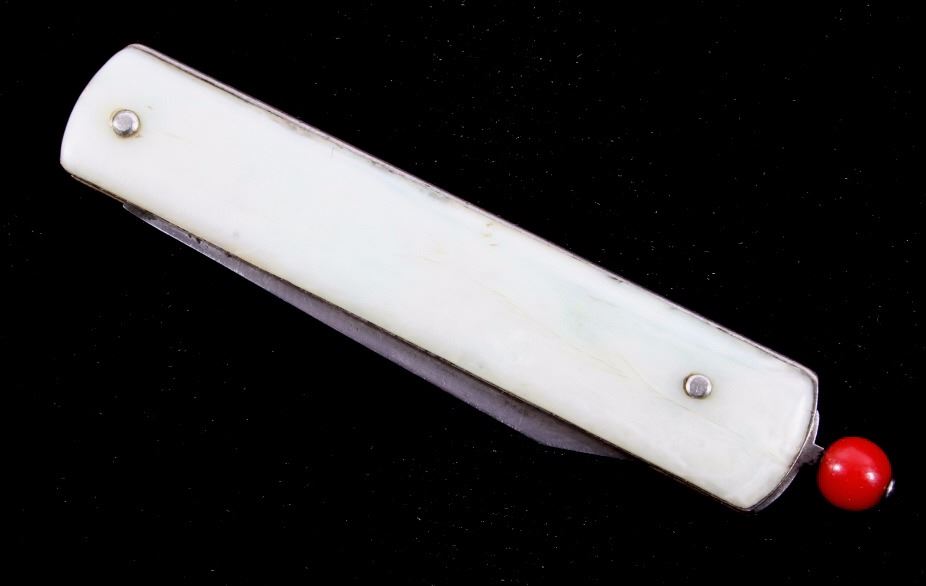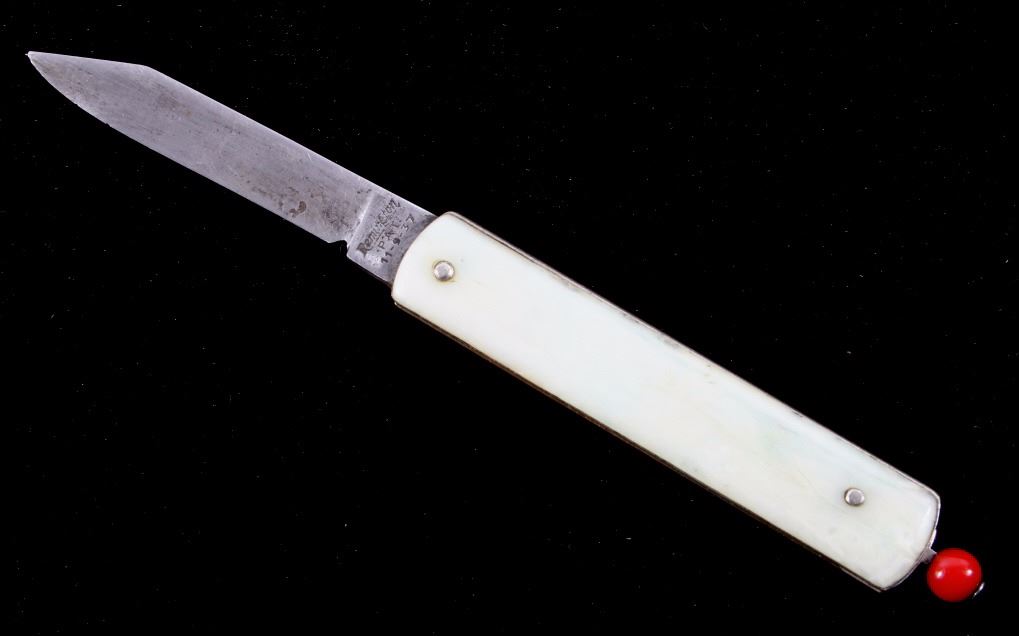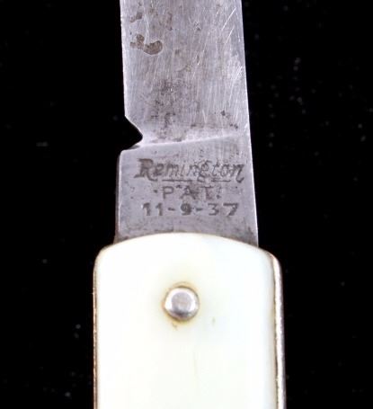 This is a Remington R-17 Pull Ball knife from the 1930's. The knife blade is marked, "Remington PAT 11-9-37". The knife shows a bakelite red pull ball mechanism which releases the spring assisted blade. The knife has a mother of pearl like bakelite grips. When closed the knife measures 2 7/8"L and when open is 5"L.