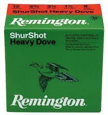 Mfr Items:Remington Ammunition Category:SHOTSHELL LEAD LOADS Mfr Scan:REMINGTON 12 GAUGE SHOTSHELLS (RSS12) Model:ShurShot Series:Heavy Dove Loads Similar Items:AMMO 12GA DOVE AND QUAIL (A12L) Gauge:12 Gauge Type:Lead Length:2.75" Ounces:1-1/8 oz Shot Size:8 Muzzle Velocity:1255 fps Rounds Per Box:25 Application:Hunting