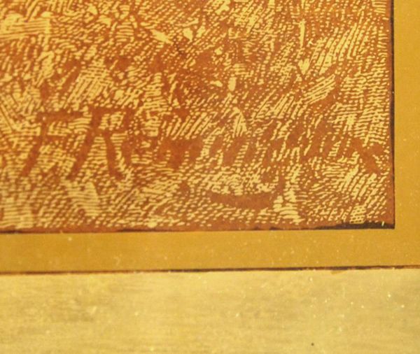 Remington Reverse Print on Glass in Frame. This is a Fredrick Remington print on glass, in a shadow-box type frame. Sepia toned print of a bronc buster. The print outline is 9.75'' x 6.25''. The wood frame is 1-7/8'' deep and 13''H x 10''W.