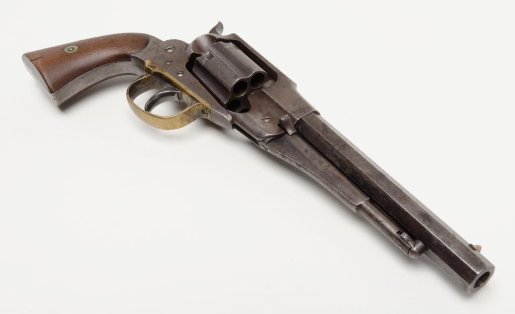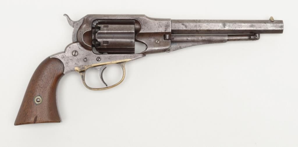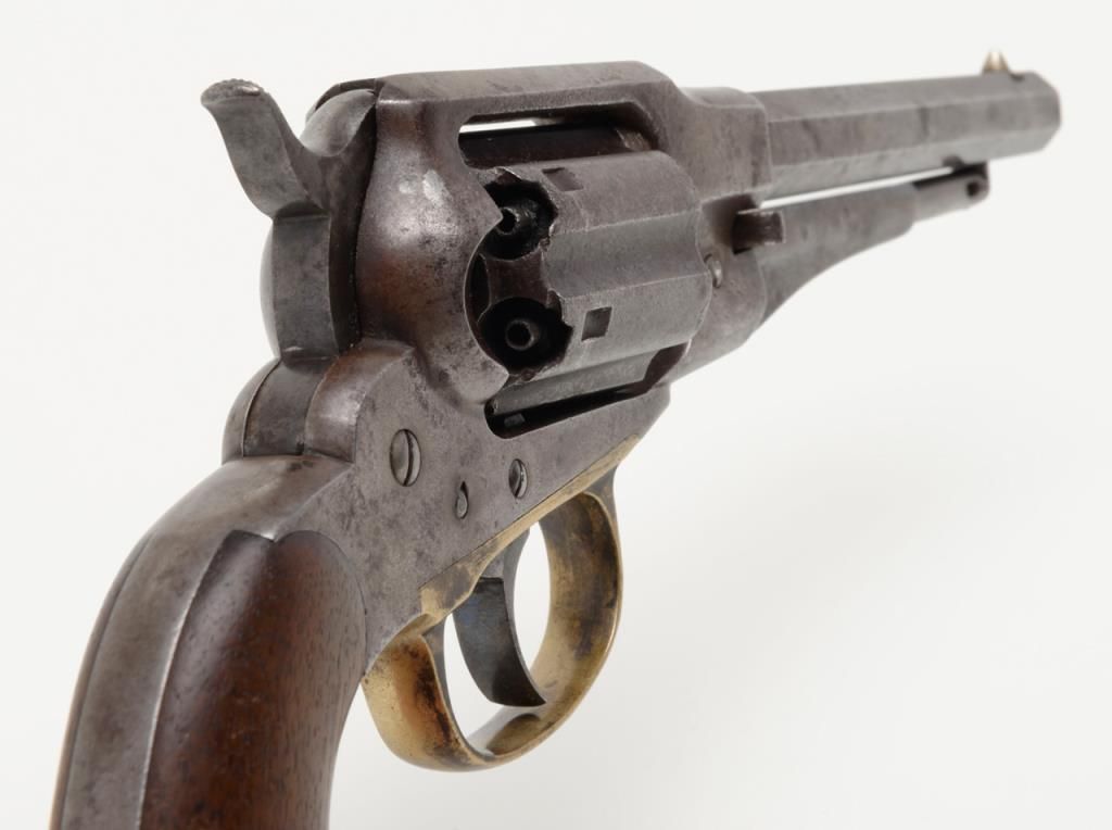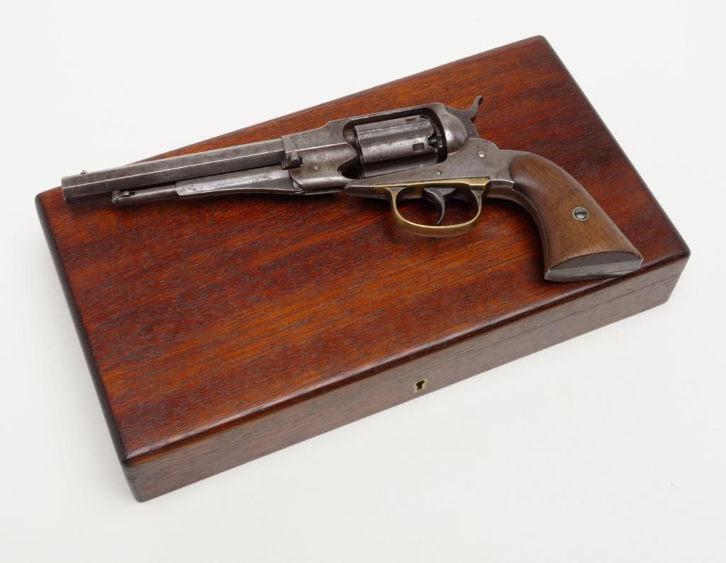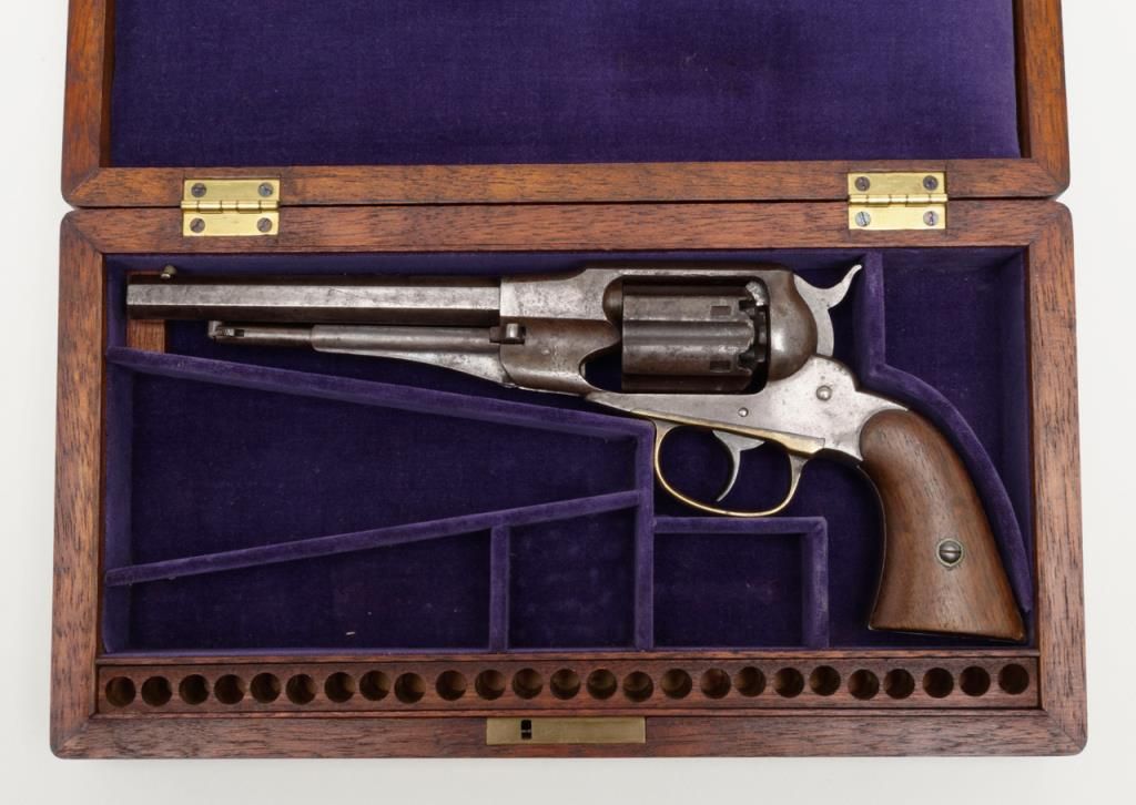 Remington-Rider DA New Model Fluted Cylinder Belt Model revolver, .36 cal., 6-1/2” octagon barrel, wood grips, #687 in overall very good condition showing a grey patina to metal surfaces with scattered spots of erosion, good markings andaction, very good bore and grips, brass trigger guard; accompanied by a well-made 20th century wood casing with compartments for accessories and nicely lined interior (no accessories included with this lot); per Flayderman’s, only a fewhundred of this variation in the Model were made circa 1863-1865. (Antique). Est.: $1,500-$3,000.