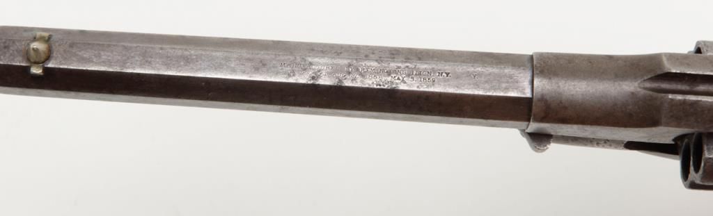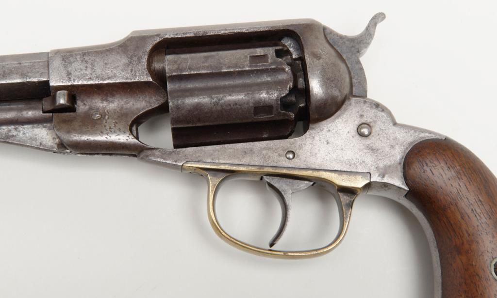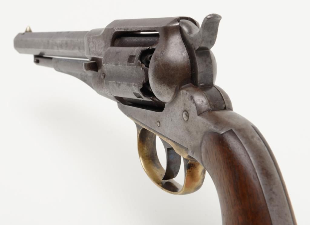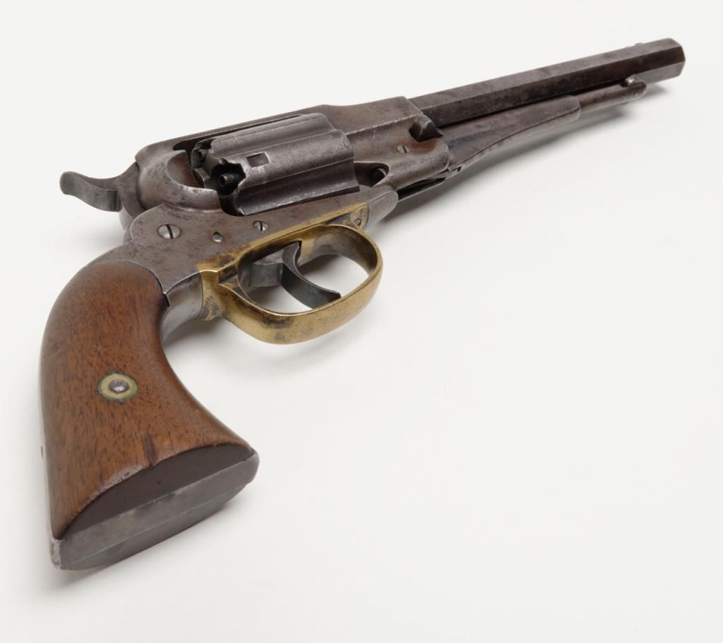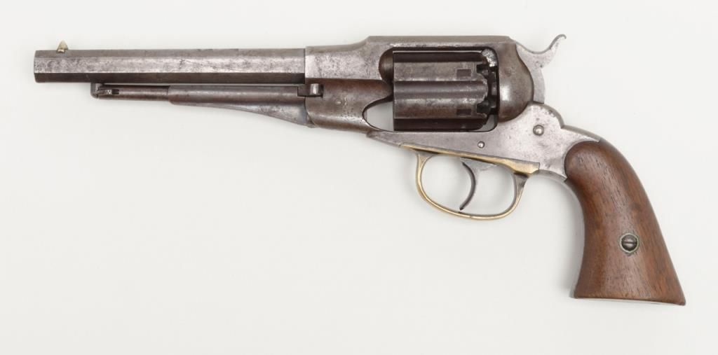 Remington-Rider DA New Model Fluted Cylinder Belt Model revolver, .36 cal., 6-1/2” octagon barrel, wood grips, #687 in overall very good condition showing a grey patina to metal surfaces with scattered spots of erosion, good markings andaction, very good bore and grips, brass trigger guard; accompanied by a well-made 20th century wood casing with compartments for accessories and nicely lined interior (no accessories included with this lot); per Flayderman’s, only a fewhundred of this variation in the Model were made circa 1863-1865. (Antique). Est.: $1,500-$3,000.