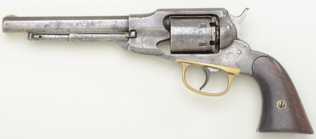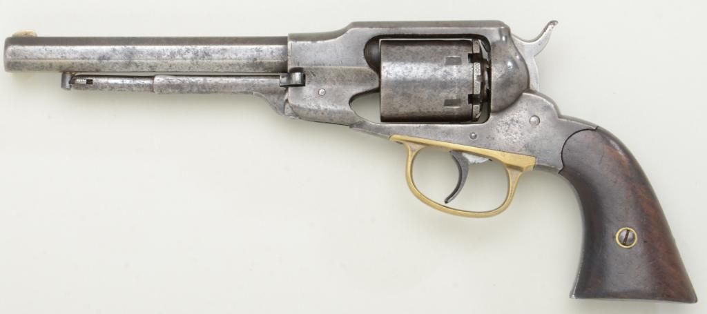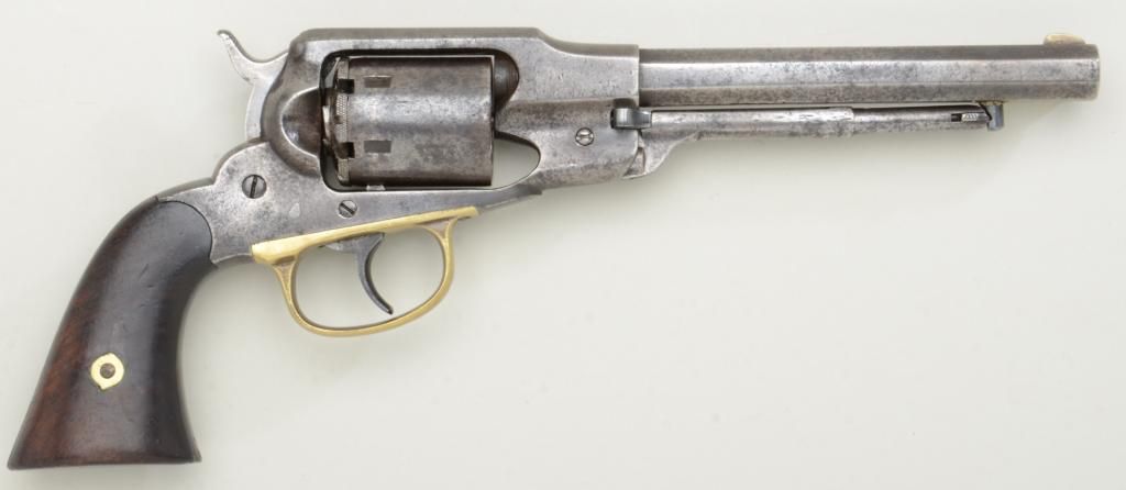 Remington Rider DA New Model belt-size conversion revolver to .38 cal., 6-1/2” octagon barrel, blue finish, brass trigger guard, wood grips, #3188. This gun is in overall good to very good condition showing a dark patina on metal surfaces with scattered pin prick pitting, good action, fair + bore, very good action and grips; gun is accompanied by an extra percussion cylinder with no nipples and showing a mottled bluefinish. Est.: $1,000-$2,000.
