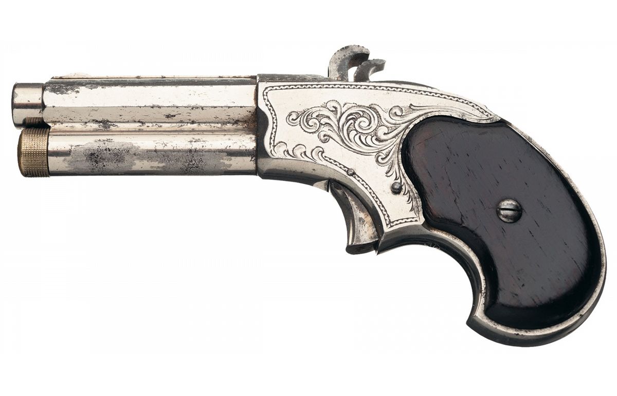 Manufactered from 1871 to 1888. The pistol has the standard factory scroll engraving with the top barrel flat marked with the two line address/patent date. Fitted with smooth bird head grips.