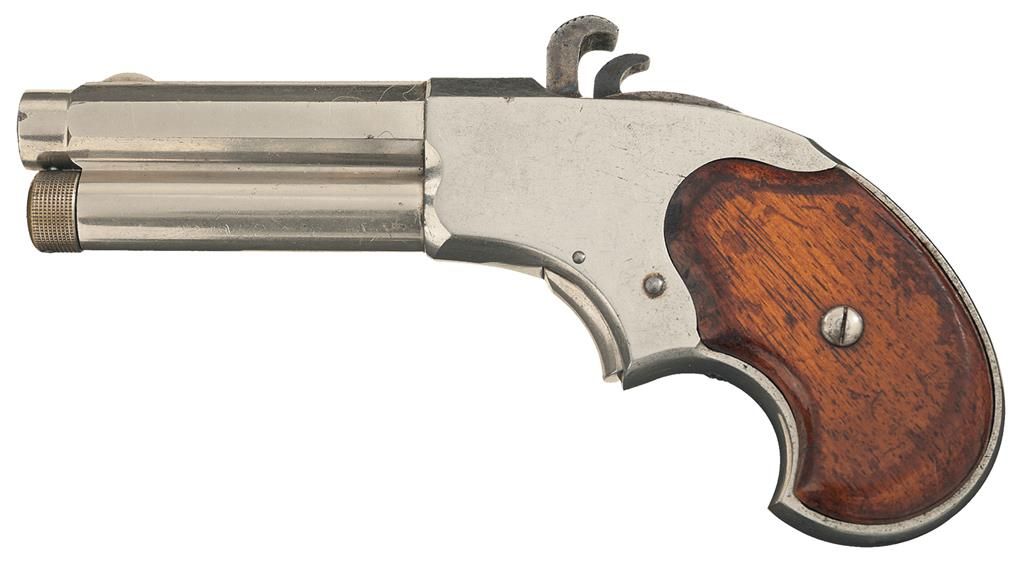 Manufactured from 1871 to 1888, with a total production of approximately 10,000, the Rider pistol was a Joseph Rider invention that is one of the most unusual Nineteenth Century pocket pistols and one of the first handguns to feature a tube magazine. Magazine loads from the muzzle end. Standard two-line address and patent markings on top of the barrel rib which reads "E. REMINGTON & SONS, ILION, N.Y./RIDERS PAT. AUG. 15, 1871". All nickel finish and fitted with smooth two-piece walnut grips. Interesting enough the Remington magazine pistol is one of the few American firearms where engraved examples are more commonly encountered than the unembellished, plain example, such as this one.