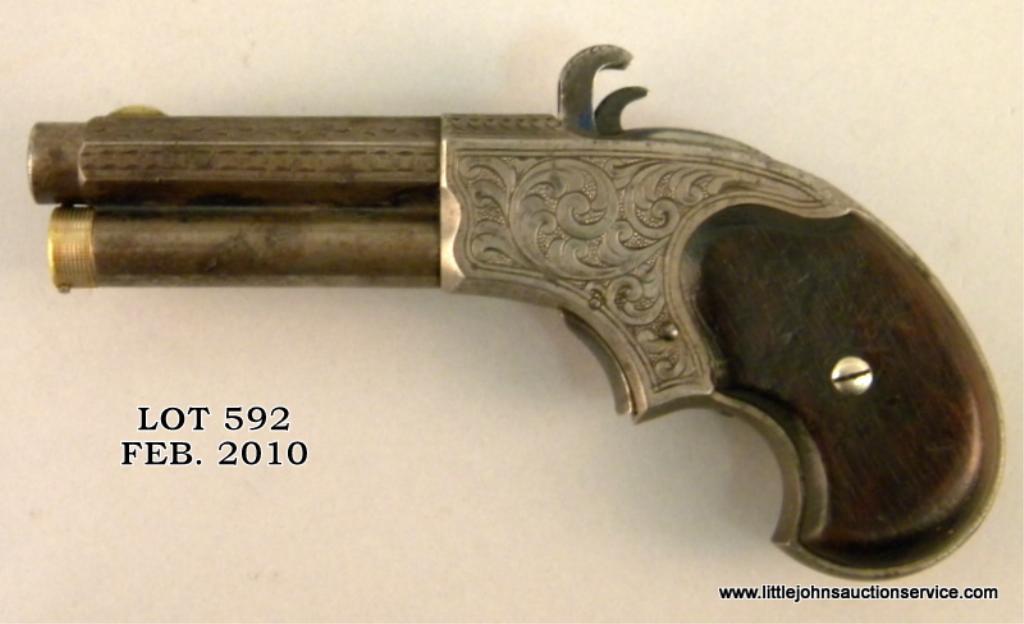 Remington Rider's patent .32 extra short caliber magazine repeating derringer, originally engraved with scarce blue and case-hardened finish. Rosewood grips. The derringer shows typical Nimschke style scrolls with his ropes and borders. Approx. 10-20% original blue and light case colors. Good markings. Bright blue on hammer. Original magazine. Good grips with some small nicks, mars, and normal aging. Est: $1,500 - $3,000