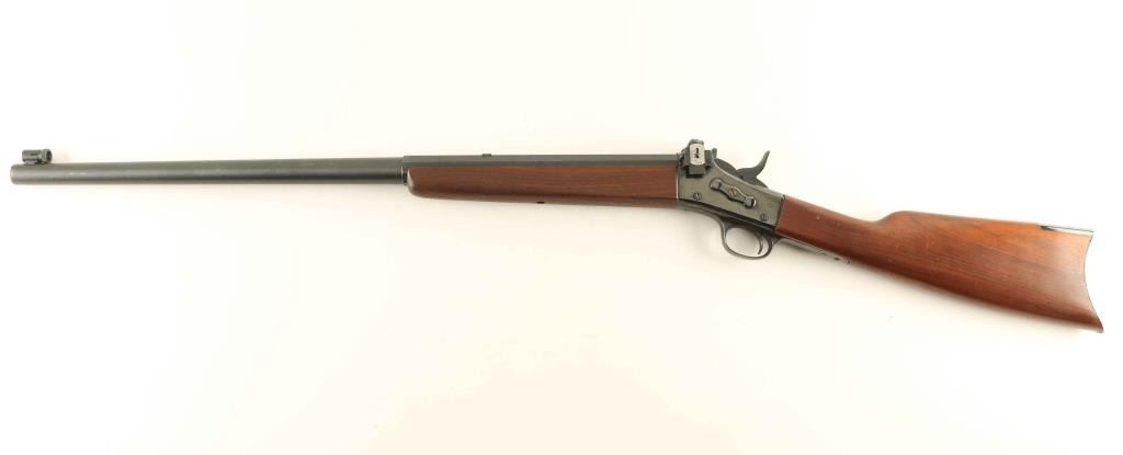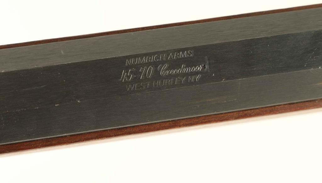Custom built rolling block single shot rifle utilizing a vintage Remington No.1 receiver. Featured a Numrich Arms 28" part octagon heavy barrel, globe front sight with post insert, blank inserted into the rear sight dovetail, adjustable receiver mounted Lyman aperture sight, smooth trigger, knurled hammer spur, smooth walnut forend and straight grip shoulder stock with crescent metal buttplate. The barrel exhibits approximately 93% of it's blued finish showing edge wear, scattered scuffs and light scratches. The receiver displays nearly all of it's polished blued finish showing blemishes under the finish and some slightly jagged edges. Action is sound, the bore is excellent and the wood stocks are very good as the buttstock is slightly ill-fitting around the wrist. Condition is NRA Very Good. ***C&R Firearm***