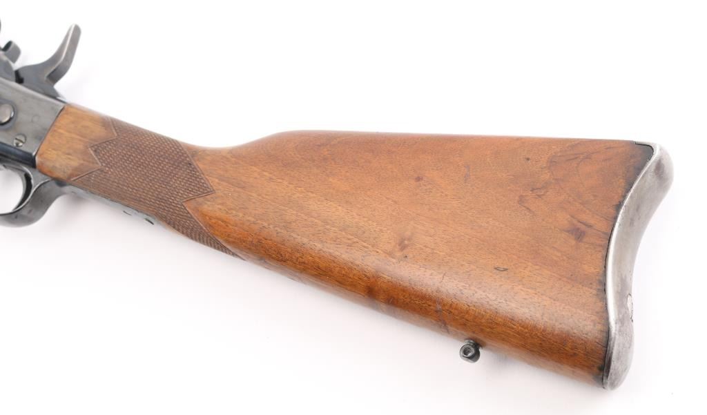 GOOD: Some minor replacement parts; metal smoothly rusted or lightly pitted in places, cleaned or re-blued; principal letters, numerals and design on metal legible; wood refinished, scratched bruised or minor cracks repaired; in good working order.