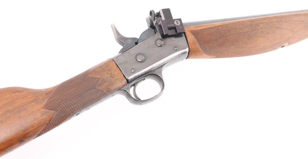 This is a custom rifle built on a vintage 3-screw rolling block action, two-line tang markings read REMINGTONS ILION N.Y.U.S.A. PAT. MAY 30 NOV 15TH 1864 APRIL 17TH 1868. (Very Feint) 30" barrel with ramped. hooded front sight, and a Williams adjustable peep sight mounted on receiver. Wide schnabel tipped, checkered forearm, straight checkered wrist butt stock with steel butt plate, (ex military with rack number '31' stamped above plate tang, and wood inset where sling swivel was). Sling studs,Tang is drilled/tapped for peep sight. Bore is very good/bright, refinished wood is very good with minor scratches/dings, action is crisp/tight, re-blue finish is very good with edge wear, rubs. Some light pitting visible under the blue on the receiver. NRA Condition-Excellent as Restored. Antique Firearm.