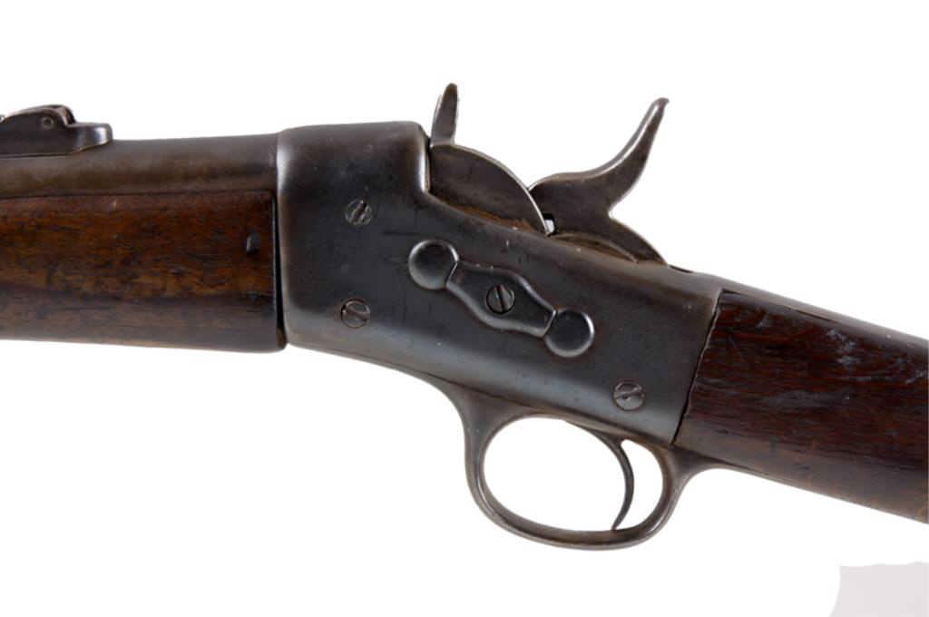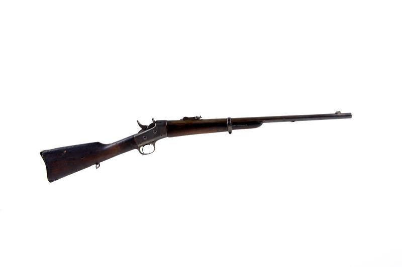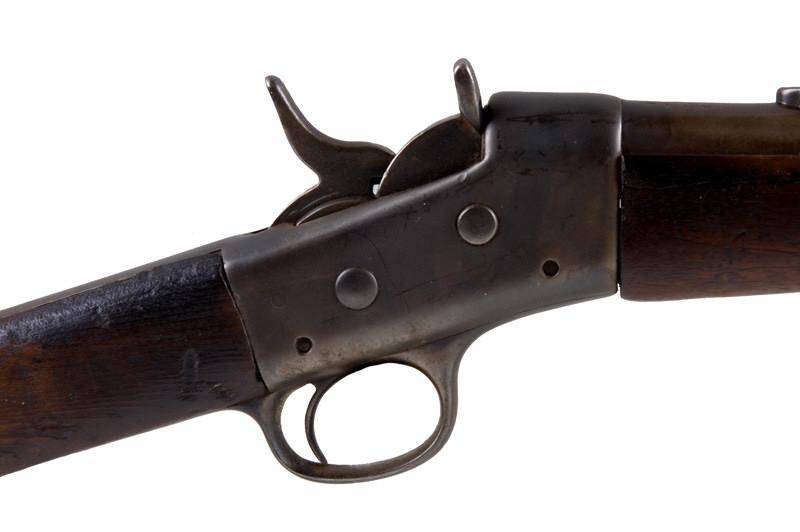Remington Rolling Block Cal .45-90 SN:NVSN Rolling block single shot carbine in .45 caliber. No martial marks visible but may be of military origin. Blued refinish, smooth straight grip stock and forearm with single barrel band, 23 1/2" barrel with adjusRolling block single shot carbine in .45 caliber. No martial marks visible but may be of military origin. Blued refinish, smooth straight grip stock and forearm with single barrel band, 23 1/2" barrel with adjustable ladder sight, barrel isshot out but action works. Condition: Good as refinished. Wood doesn't fit well at the forearm and may be a replacement.