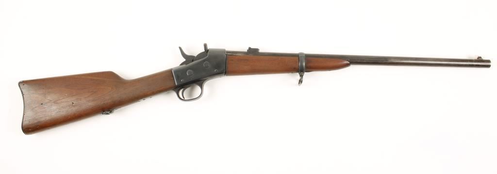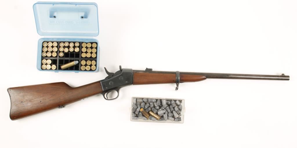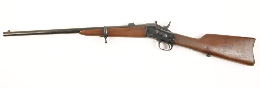 Blued single-shot carbine with a 22" barrel. Metal appears to have been refinished and is in good condition with light pitting, wear/fading on the barrel and worn roll-stamps on upper tang. An "anchor" is stamped on the top of the barrel. Front sight is a replacement. Bore is very good. Action is fine. Wood forend is ill-fitted to the receiver and has a repair to the left of the barrel channel at the receiver. Butt stock has dings and rubs. Condition is good. *Antique Firearm*