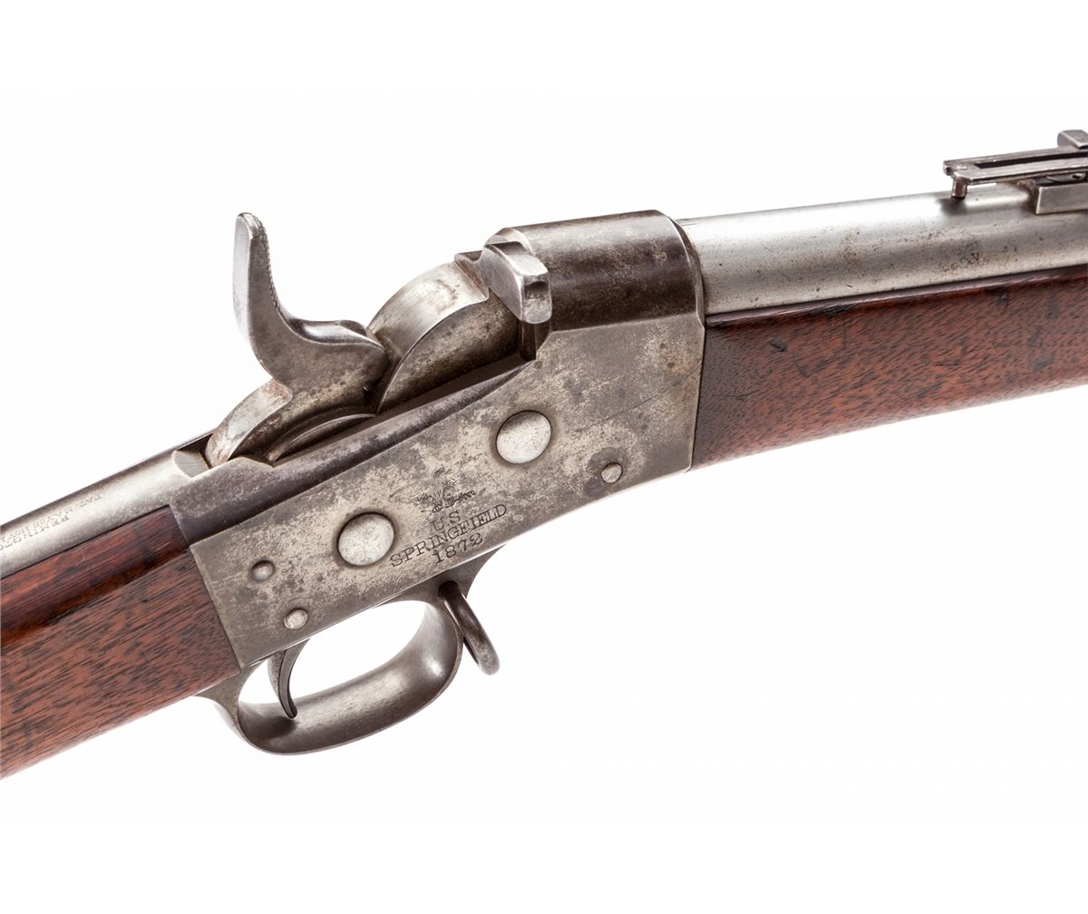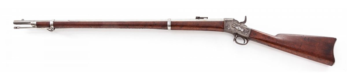 Remington Rolling Block Model 1871 Single Shot Rifle, NVSN, .50-70 cal., 36'' bright barrel, case hardened framed marked ''U.S. Springfield 1872'' to right side; left side marked ''Model 1871''; walnut stock and handguard. Stock with Allin cartouche. Ramrod is present. Condition is fine to near excellent. Barrel with minor spots of discoloration. Frame has silvered and toned. Action is good, bore is fine. Est.: $1,800-$2,400. (Antique)