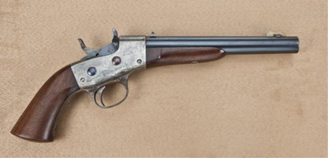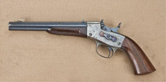 Remington Rolling Block Navy .22 caliber plinker, 8” barrel, blue and case hardened finish, standard wood stocks with blade front sight and v-notch front sight, marked “Remington Arms Co. Ilion, NY” on barrel, also marked “Remington Arms Co. Ilio NY” on bottom right side of frame. No serial number. Believed to be prototype or sample for this model. Refer Remington Rolling Block Pistols, page 129, formerly Karl Moldenhauer collection, and Landskron collection. The pistol remains in original very good plus to near fine condition showing 75-85% original blue on barrel, some losses along left edge of barrel, some minor erosion and pinprick pitting just starting. The frame shows 75-85% case hardening on left, 65-75% on right, drifting on the instrap, approx. 50% on backstrap. The small parts on breech show most of their bright original blue. There is some scattered light erosion and pinprick pitting just starting in a few areas. The grips are very good plus to near fine with just some slight handling marks. Action good, bore fair with some slight roughness. An key variation in the series. From the Jerry Landskron collection. Est: $3,500 - $7,000