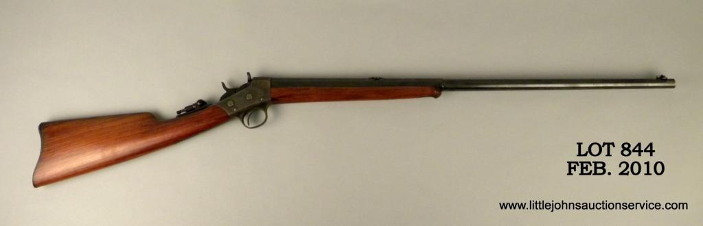 Remington Rolling Block No. 2 Sporting single shot medium frame rifle, .25 cal., 26” half round/half octagon barrel, blue and case hardened finish, wood stocks, #34134. This rifle is in overall very good to excellent condition showing approx. 97% original blue on barrel with some scattered points of erosion primarily at the muzzle area; approx. 95% original case color on frame and butt plate, fine bore, crisp action; very good markings including two European proof marks at the breech; unmarked Lyman type adjustable tang sight with a blank in the rear sight dovetail and a flip-up globe front sight. Est.: $900-$1,800.