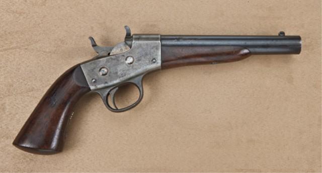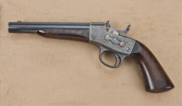 Remington Rolling Block model 1870, .50 caliber centerfire pistol, serial number 4141 on bottom of barrel, forward of forend, blue and case hardened finish, cartouche wood stocks. Shows Don Ware number painted on right side of grip, 29-150. The barrel shows Naval anchor and inspection marks, the frame shows P proof over FCW on right side. The barrel retains approx. 70-80% original blue finish, evenly thinning and toning, with some light erosion and pinprick pitting just starting. The frame shows 30-50% case hardening drifting to a smoky grey patina. The wood grips are very good with strong cartouche on left, some minor storage marks, handling and slight wear. The edges are sharp, action crisp, bore good. Also of the Jerry Landskron collection. A good example from two of the most recognized Remington collections. Est: $2,500 - $5,000