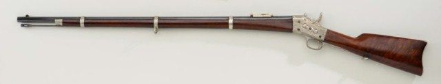 Remington Rolling Block rifle, extensively period scroll engraved in the New York style, possibly by the shop of L.D. Nimschke, blue and nickel finish that likely were applied at the time of the engraving, .50 cal., 35”round barrel, deluxe select wood stocks, three barrel bands, sling swivels and cleaning rod; collection or museum brass ID tag attached to trigger guard “200”. This gun is in overall fine condition showingextensive engraving to the receiver, both ends of the barrel, hammer, rolling block, butt plate, rear sight base, barrel bands, trigger guard and even to the rear sling swivel base; fine bore, crisp action, sharppatent markings on top tang; wood is overall very good to fine with some scattered old mars and scratches from storage, beautiful flame graining to the butt stock; one of the most extensively engraved Rolling Blockrifles we have seen in some time. Est.: $3,500-$7,000.