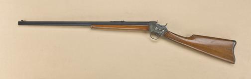 Remington Rolling Block single shot No. 2 Sporting rifle, .22RF cal., 24” octagon barrel, blue and case hardened finish, wood stocks, #H40744. This gun is in overall fine + condition showing approx. 80% originalmuted blue on barrel and approx. 85% original case colors on the frame, very good bore, crisp action, sharp markings, fine wood stocks with some scattered nicks from storage and an ebony wood insert at the front end of the fore stock. Est.: $300-$600.