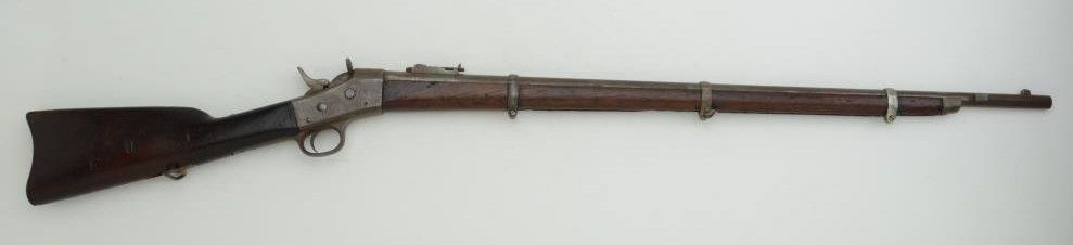 Remington Rolling Block single shot musket, 1mm cal., 34” barrel with integral bayonet lug on the right side at muzzle, sling swivels, grey patina, wood stocks, #NVSN. This gun is in overall fair to good condition with a grey patina over scattered pin prick pitting, rough bore, fair action, well worn wood with scattered mars, scratches and dings, old initials carved into right side of butt stock with some type of cartouche on the left side of the butt stock; missing ramrod. Est.: $500-$800.