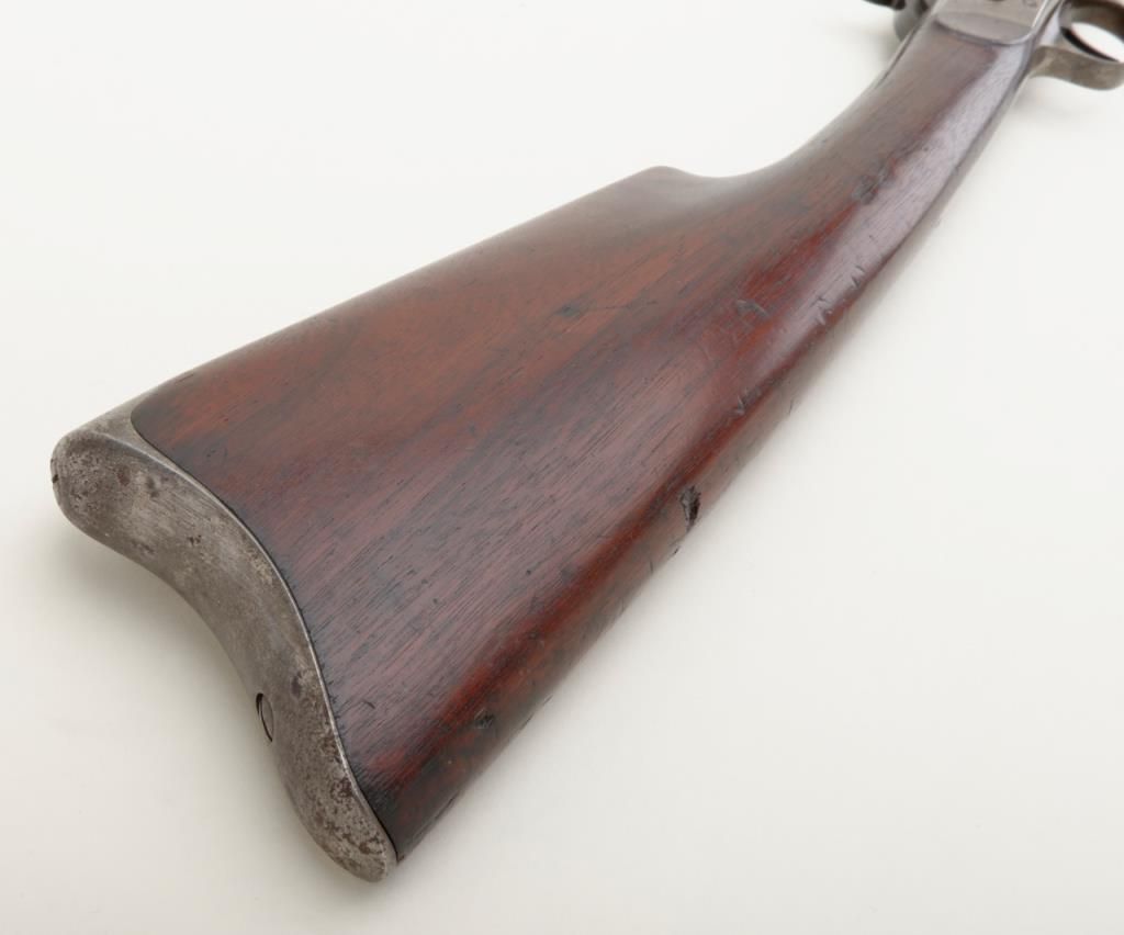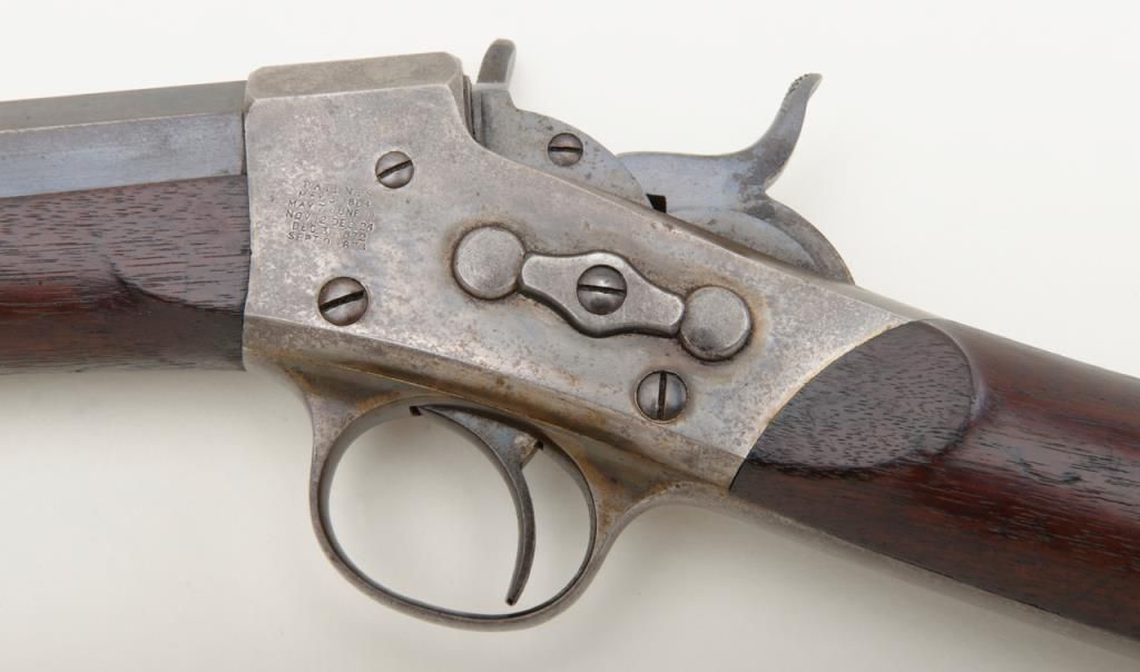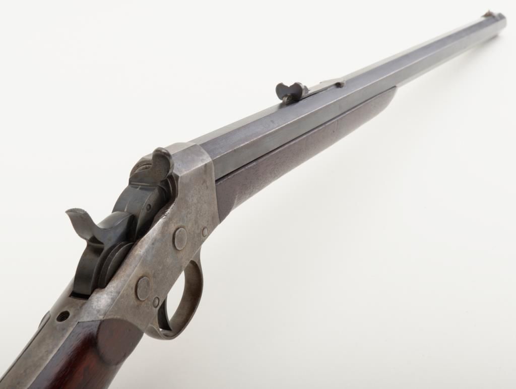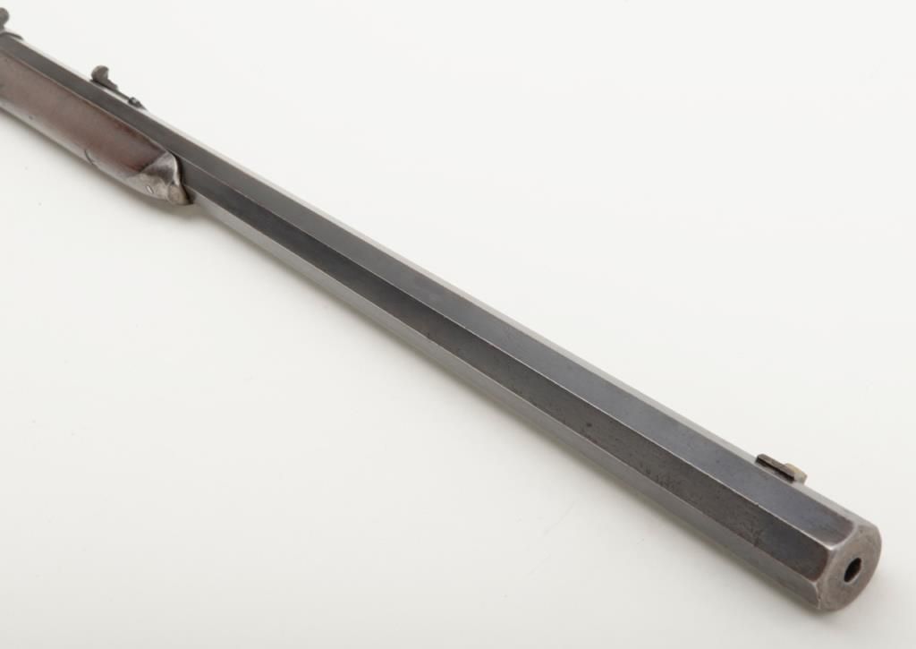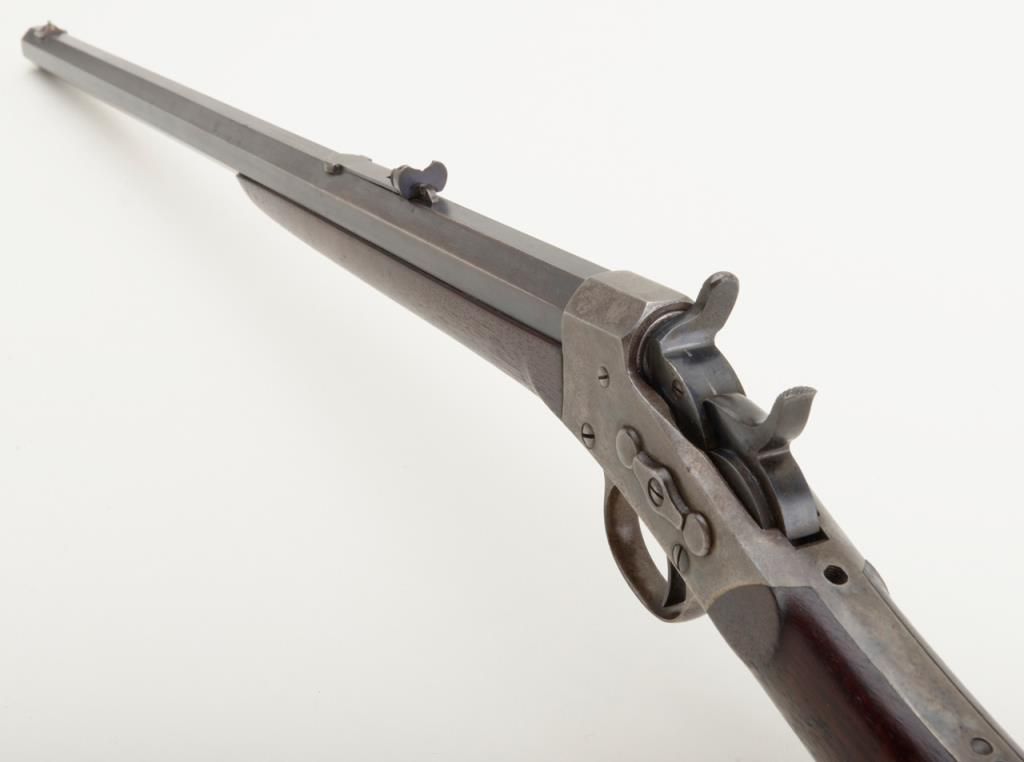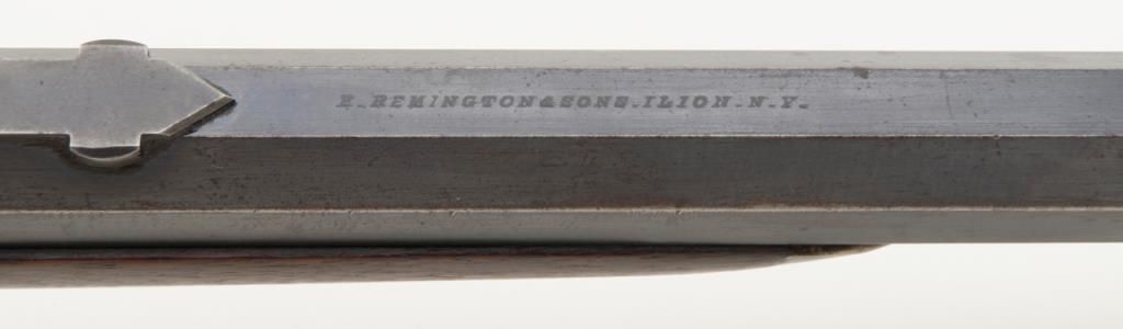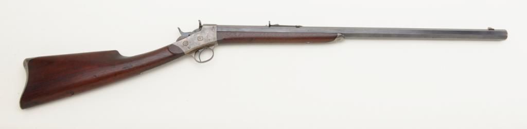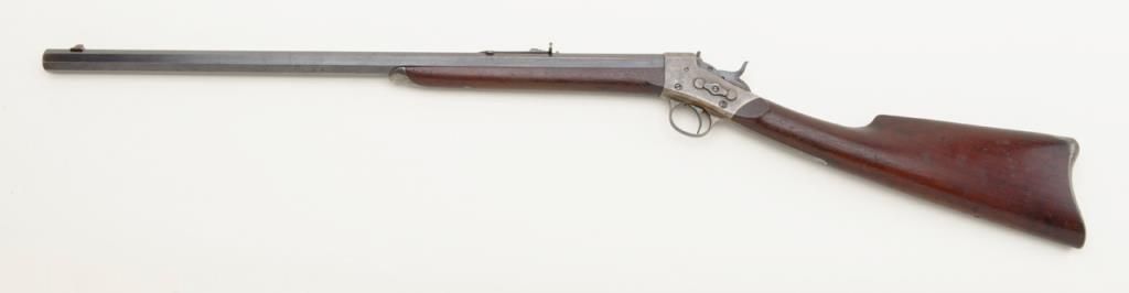 Remington Rolling Block single shot rifle, .22 cal., 24” octagon barrel, blue and case hardened finish, wood stocks, #14874 in overall very good condition showing considerable muted original blue on the barrel with traces of case colors on the receiver; good bore, action, markings and wood stocks. (Antique). Est.: $200-$400.