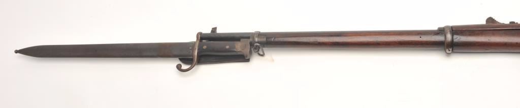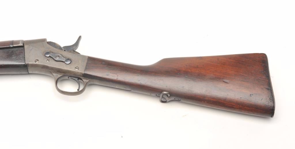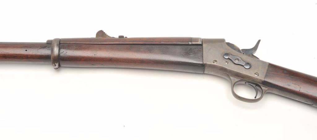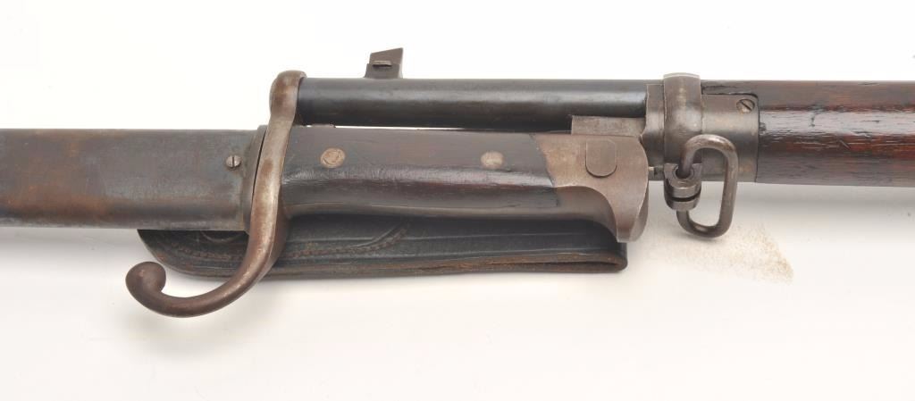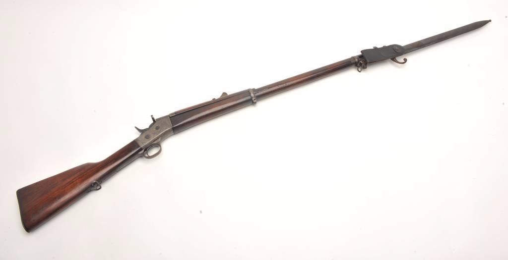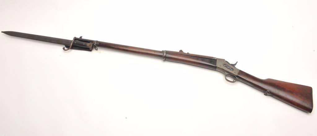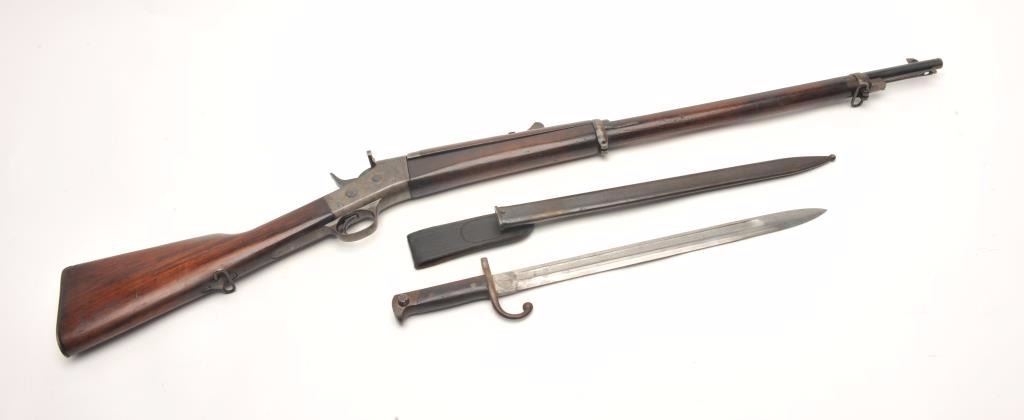 Remington Rolling Block single shot rifle, 7mm caliber, 30” barrel, blued and case hardened finish, wood stocks, no visible S/N, in overall very good to near fine condition displaying the majority of its original blueon the barrel and majority of its original muted case colors on the receiver; very good bore, crisp action and markings, very good + wood stocks. Accompanied by a very good bayonet, metal sheath and leather hanger.(C&R/PPT). Est.: $350-$700.