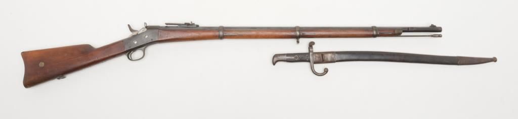 Remington Rolling Block single shot rifle, approximately .45 caliber, Serial #67734. The rifle is in overall good to very good condition with a 32” blued barrel. The barrel retains a significant amount of its blued finish with anadjustable rear ladder sight. The action shows muted case color and is marked “M-1867”. The smooth wood stocks are serialized to the rifle, show several cartouches and is in overall good condition. A small brass inlay in the buttstockappears to be a rack number. This Norwegian contract rifle has a very good bore, crisp action and sharp markings. It comes with a hook bayonet, marked “Alex Coppel, Solingen”. The 26” bayonet has a leather scabbard with metal hardware.(Antique). Est. : $600-$1,200.