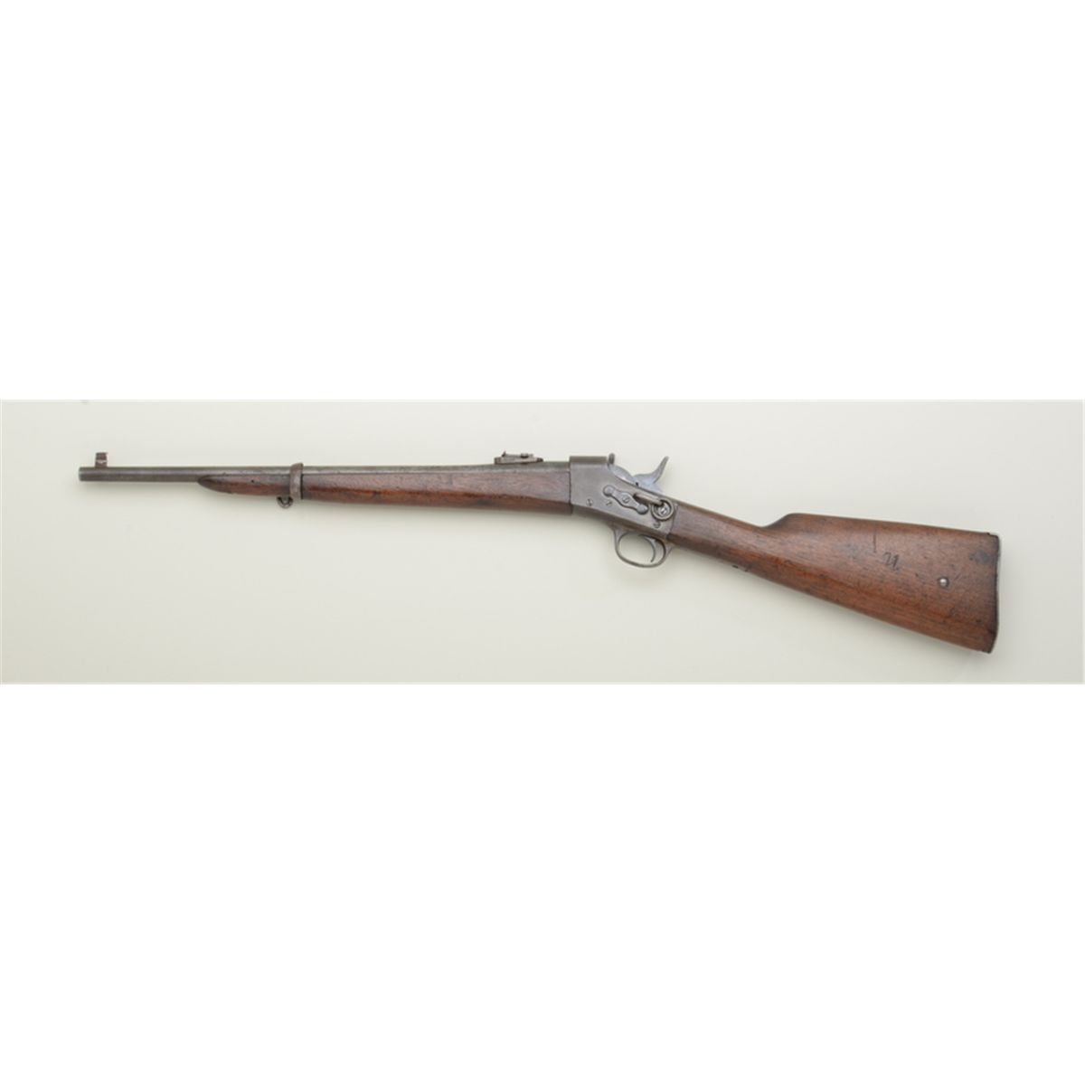 Remington Rolling block military style carbine, 7.65mm cal., 21-1/2” barrel, blue and case hardened finish, wood stocks, #NVSN. This gun is in overall very good condition showing a grey patina on the barrel withscattered pitting, grey patina to frame with slight silvery toning in protected areas, crisp action, very good bore and wood stocks with sling swivels, saddle ring and two iron tacks, one on each side of the butt stock.Est.: $300-$600.