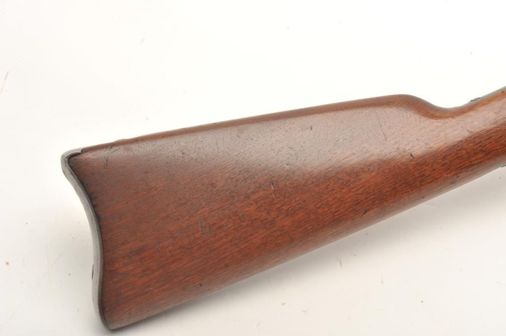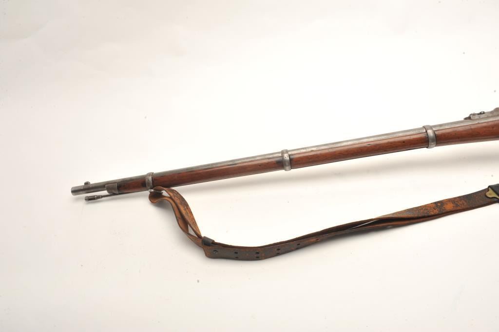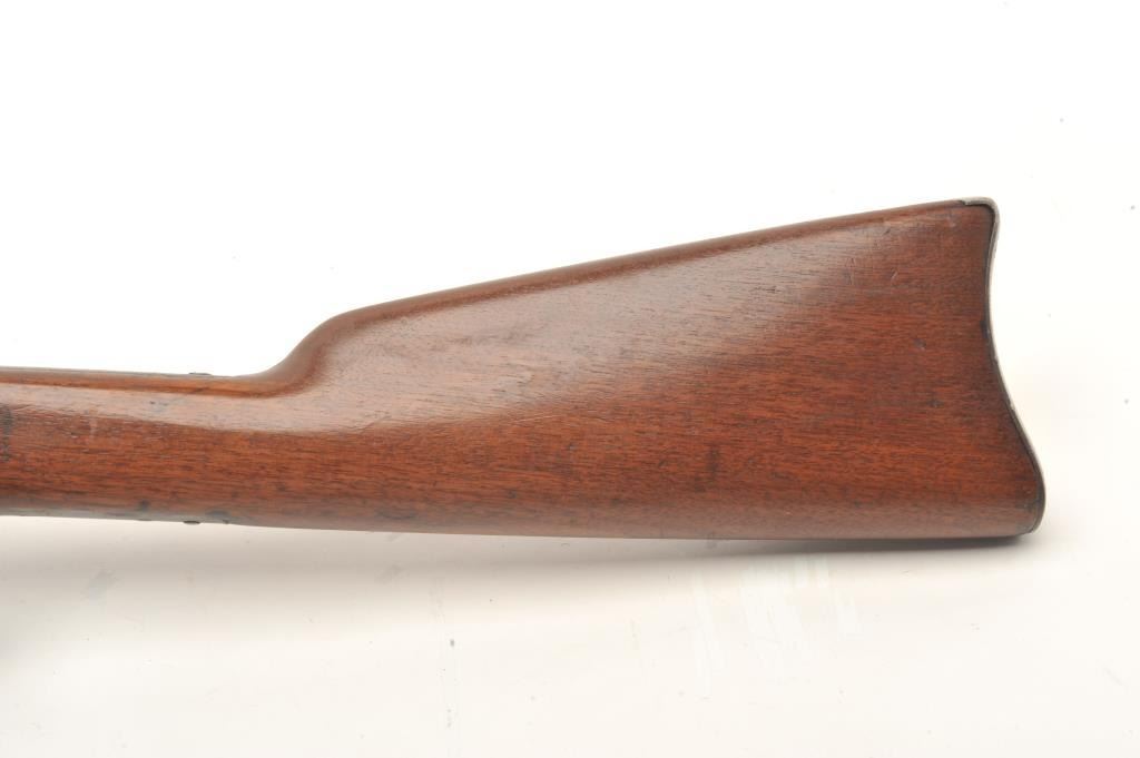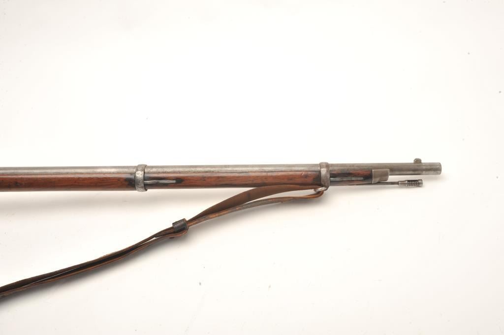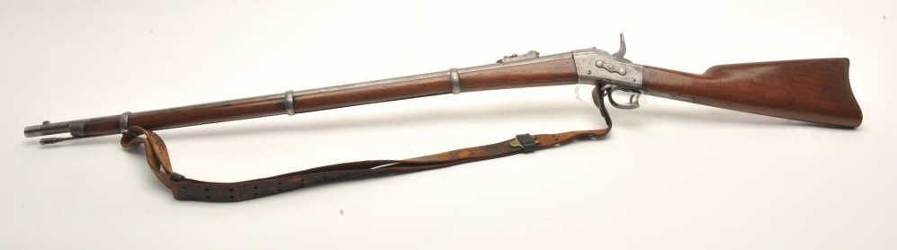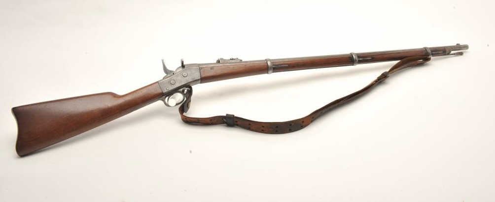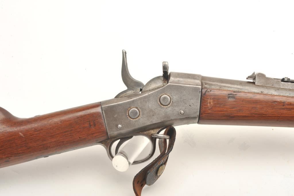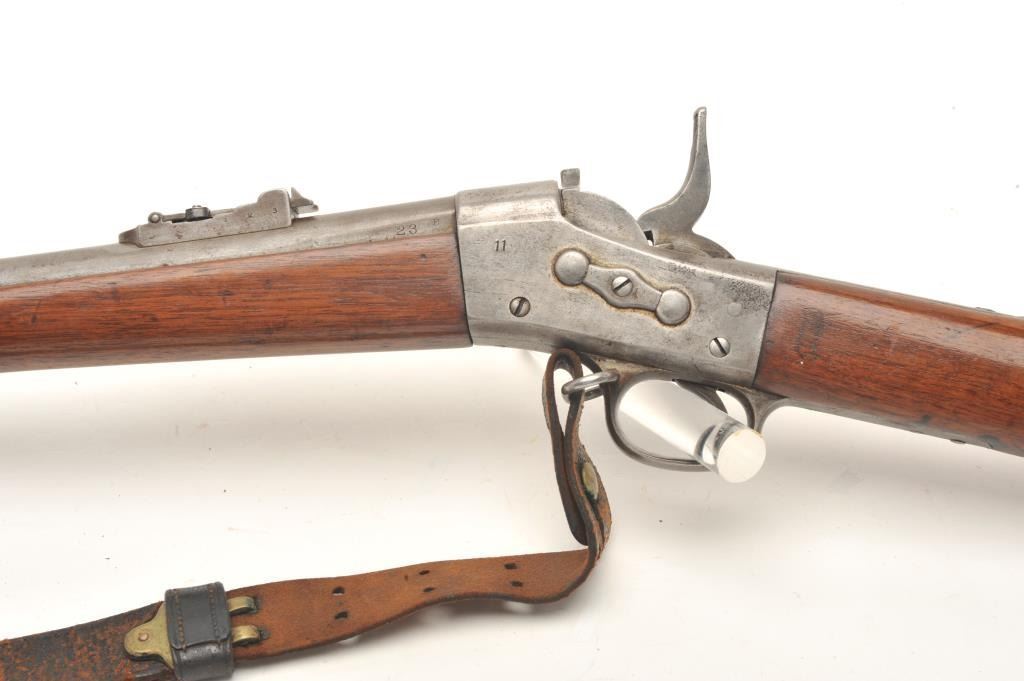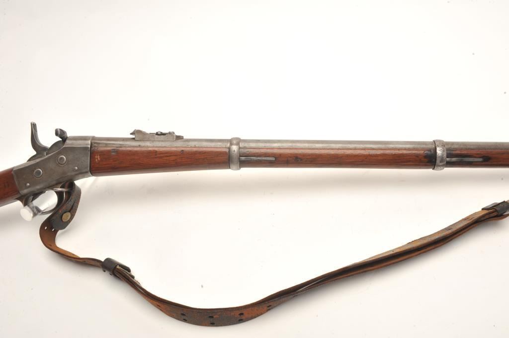 Remington Rolling block rifle, .50-70 caliber, 36” barrel, wood stock, leather sling, no visible S/N, in overall good condition with a good bore, crisp action and generally good wood displaying scattered oldmars and scratches from carry and storage; “23” stamped on left side of barrel at breech; “11” stamped on left side of receiver and “48/H” stamped on top of butt plate; visible inspector’s cartouche on left side of butt stock at rear tang; possibly a militia gun like New York. (Antique). Est.: $300-$600.