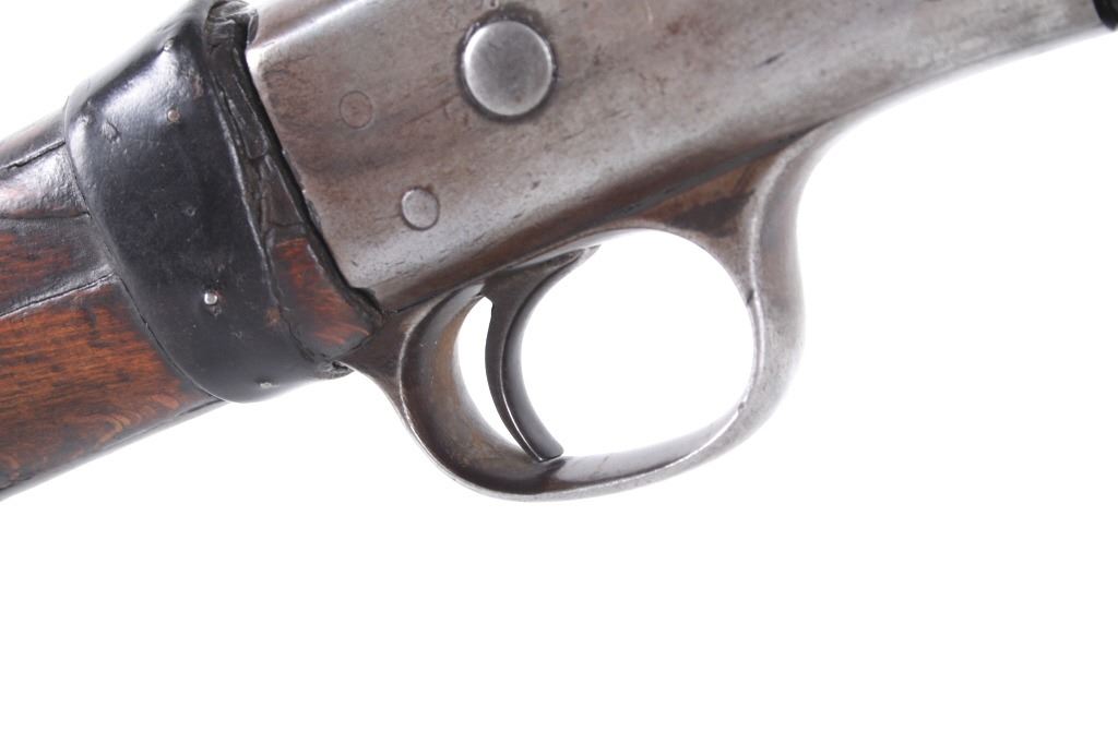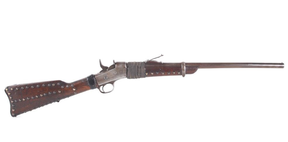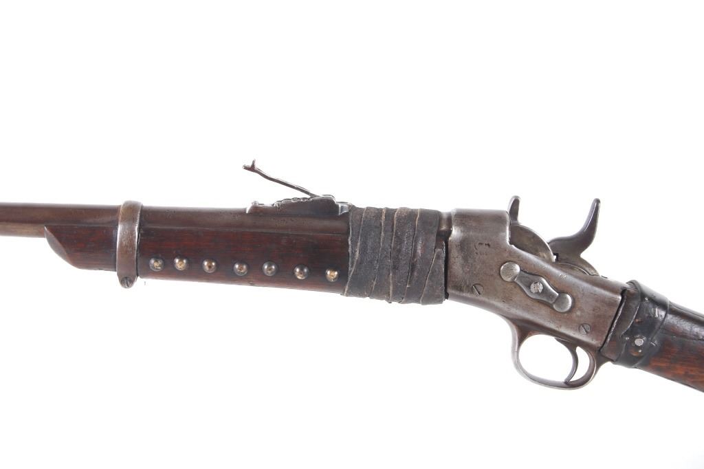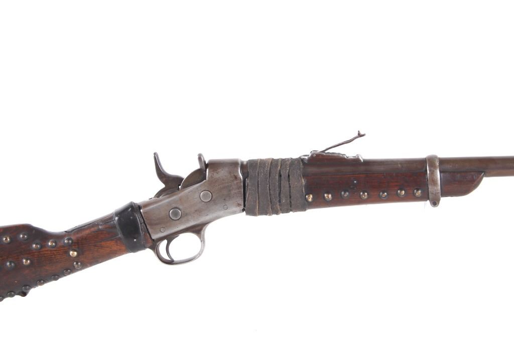 22” carbine length. Metal surfaces show a deep aged patina with no indication of cleaning. The rear sight is of the original Remington military style and shows some battering from years of use. The action still functions and while the bore is dark and somewhat rough, still shows good rifling. The butt stock also retains the inletted sling swivel base that shows the same dark patina as the tacks and leather. This is a truly remarkable example typical of the Southern Plains of the 1870s-1890s period. Winderful history and visual appeal in this fine artifact. This firearm qualifies as an Antique, and does not require FFL Transfer or NICS Background Check.