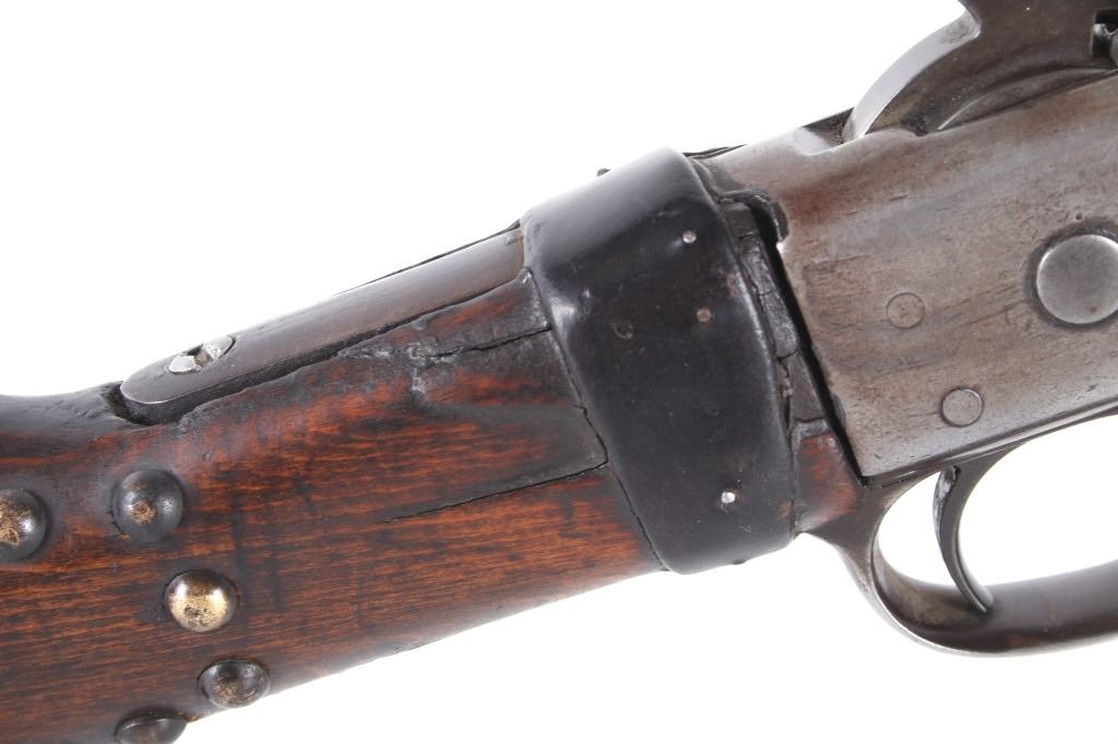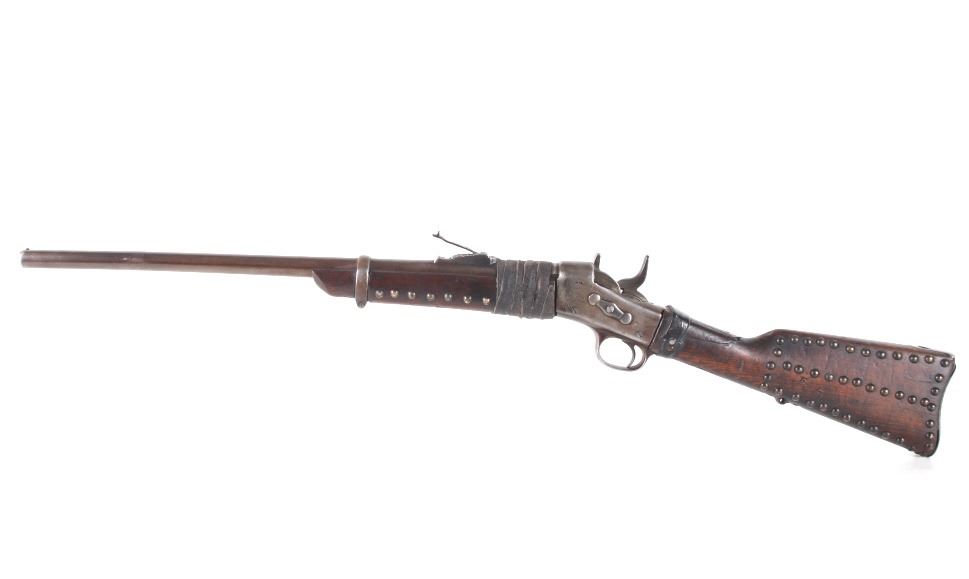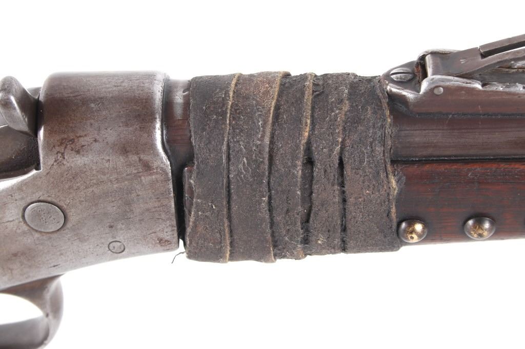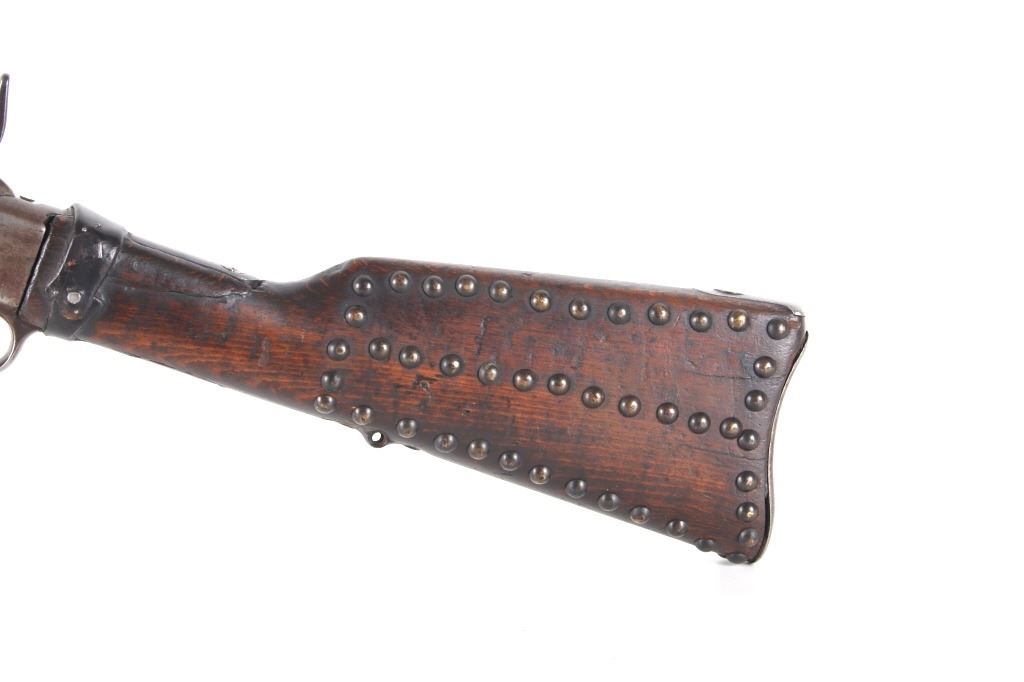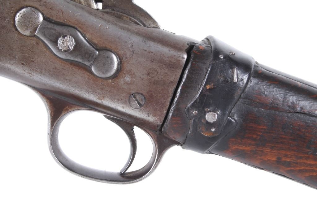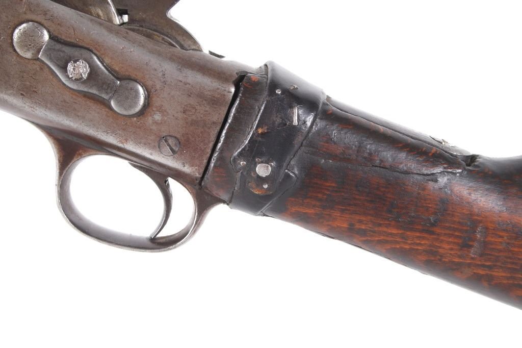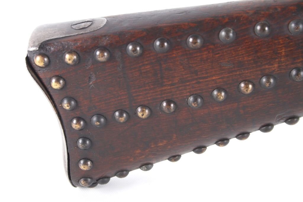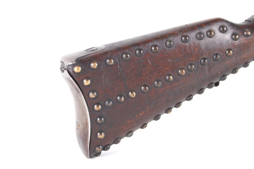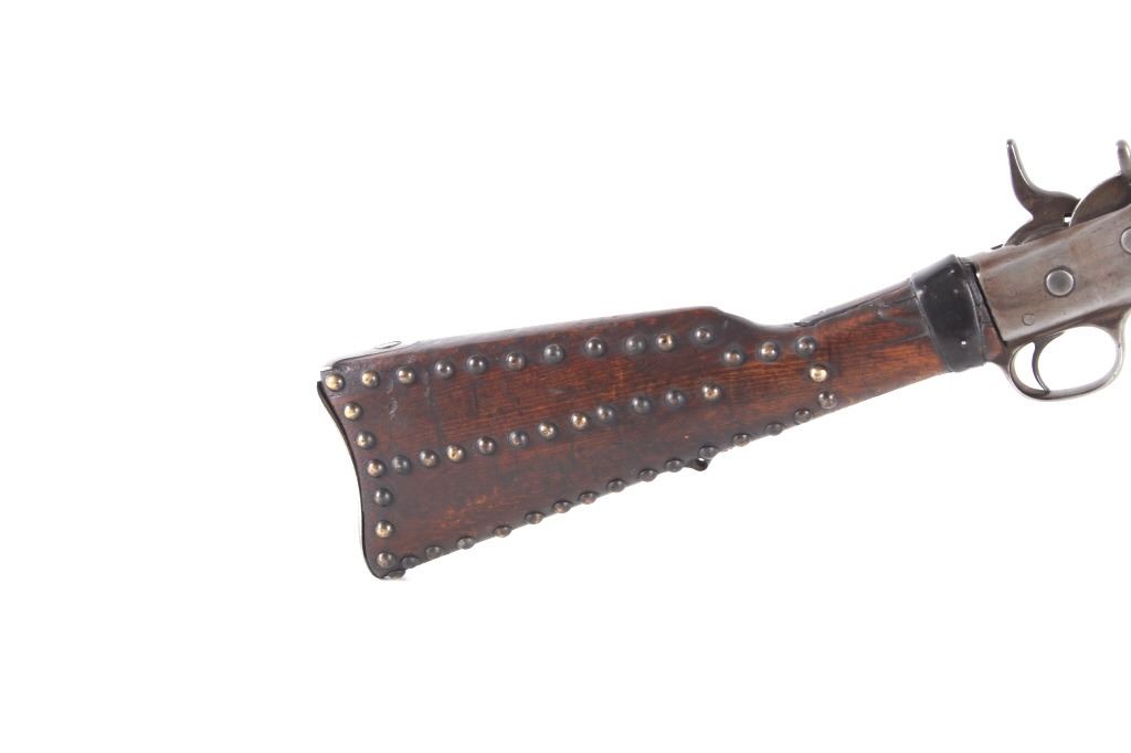 great age and frontier usage. This was originally a military rifle in caliber .43 Spanish (which is basically the same as the famed .44-77 “Buffalo Cartridge”) and subsequently altered for horseback use. The Remington Rolling Block single shot rifle was the standard arm in Mexico and found favor with frontiersmen and Native Americans especially in the Southwestern U.S. Ammunition for this caliber in this area during the latter half of the 19th century was easiy to acquire and was powerful enough for any Western use- from hunting the largest of game, like buffalo and elk to self defense. This example shows several rows of brass tacks in the butt stock and on the forend. The butt stock has the standard steel butt plate that is actually worn through to the wood of the stock on the top rear portion! The tacks themselves display a very dark and aged patina that blends perfectly with the aged quality of the wood. There is a rawhide repaired crack at the wrist of the stock that also shows great age and wear. The forend is likewise fastened to the barrel with wrapped strips of rawhide shrunk to fit. The forend