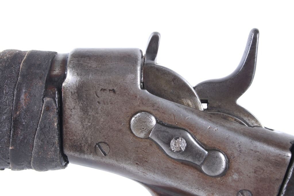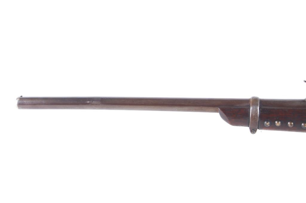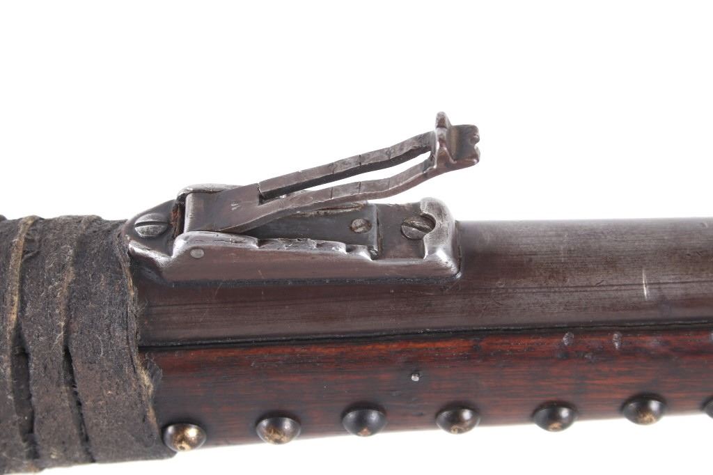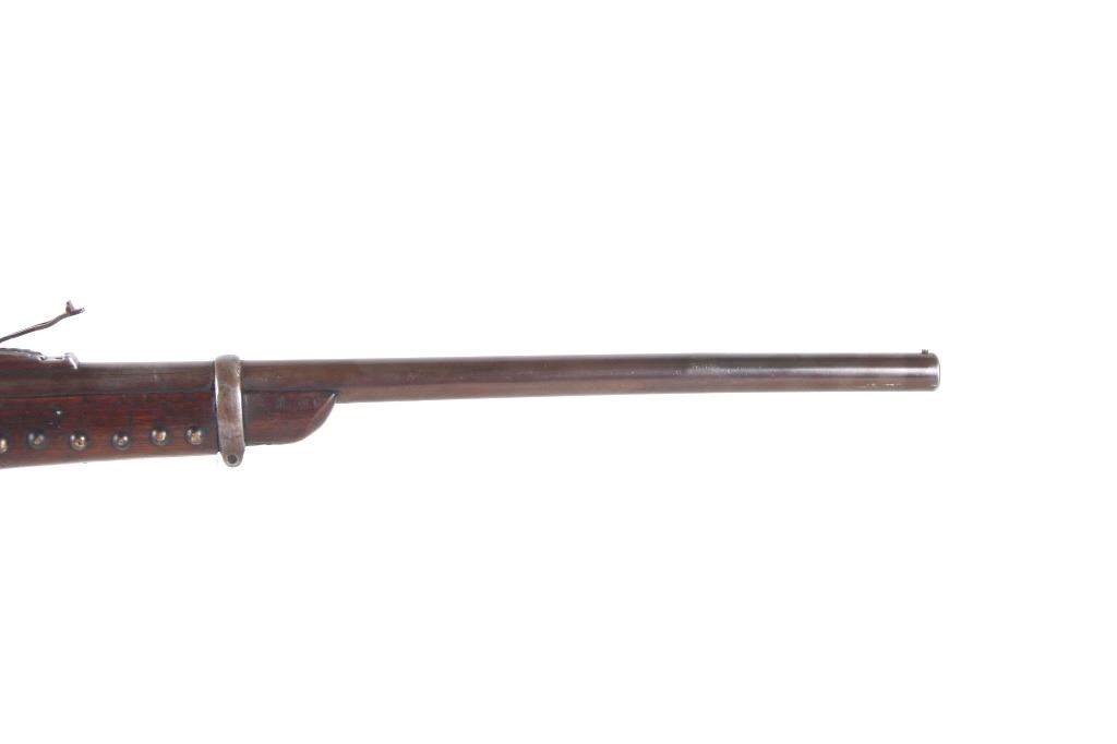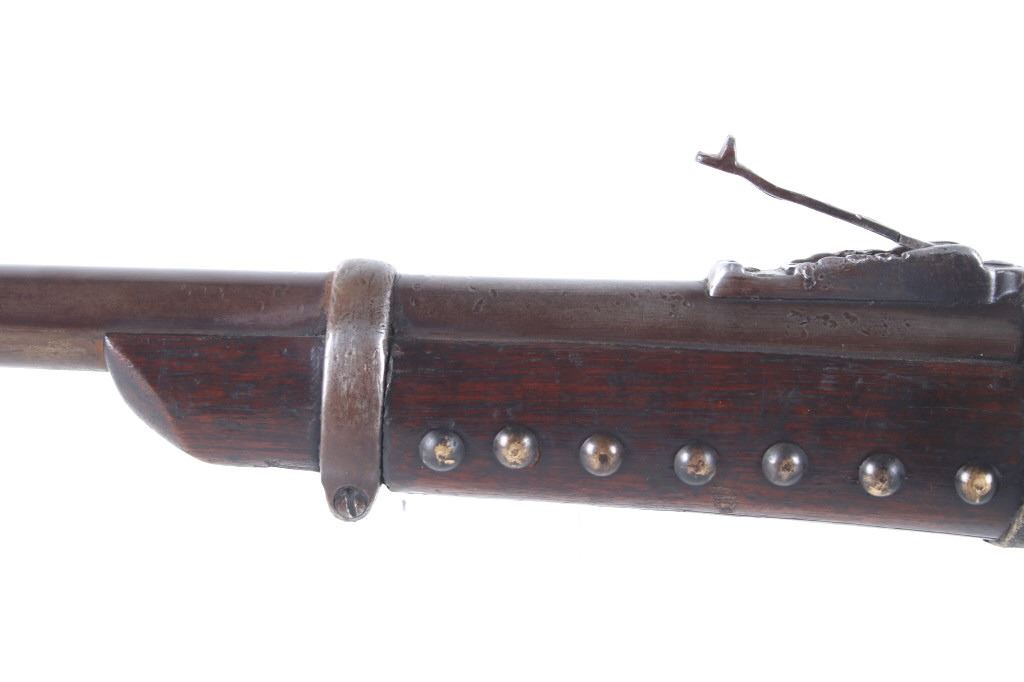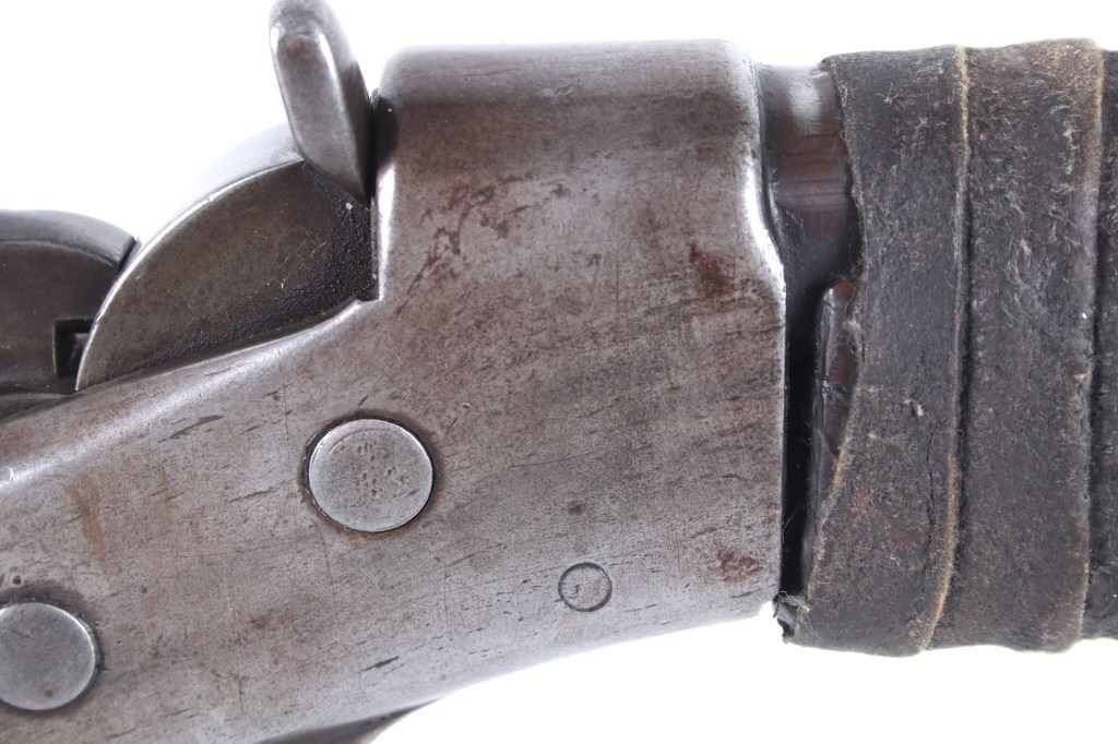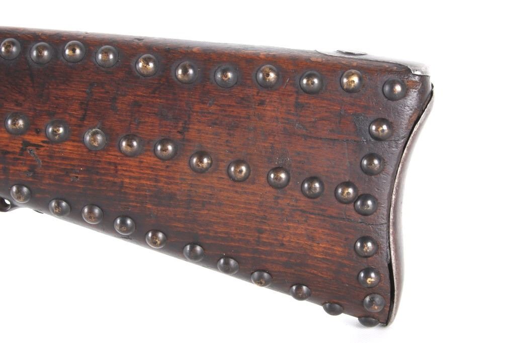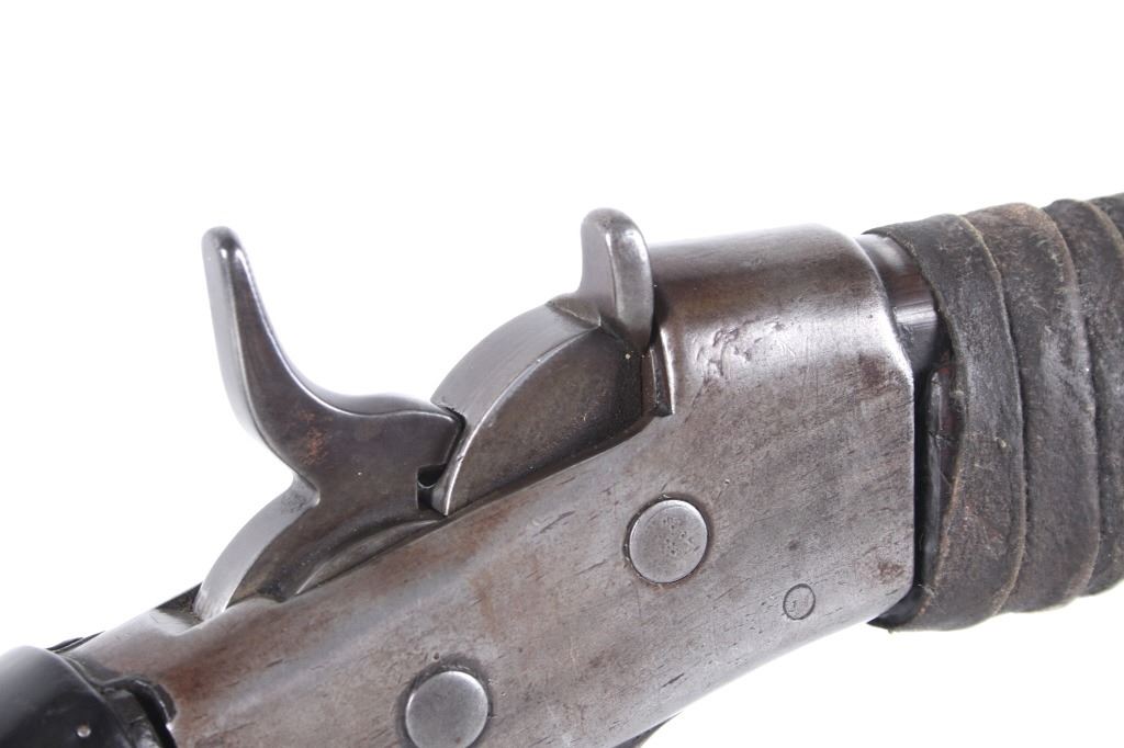 great age and frontier usage. This was originally a military rifle in caliber .43 Spanish (which is basically the same as the famed .44-77 “Buffalo Cartridge”) and subsequently altered for horseback use. The Remington Rolling Block single shot rifle was the standard arm in Mexico and found favor with frontiersmen and Native Americans especially in the Southwestern U.S. Ammunition for this caliber in this area during the latter half of the 19th century was easiy to acquire and was powerful enough for any Western use- from hunting the largest of game, like buffalo and elk to self defense. This example shows several rows of brass tacks in the butt stock and on the forend. The butt stock has the standard steel butt plate that is actually worn through to the wood of the stock on the top rear portion! The tacks themselves display a very dark and aged patina that blends perfectly with the aged quality of the wood. There is a rawhide repaired crack at the wrist of the stock that also shows great age and wear. The forend is likewise fastened to the barrel with wrapped strips of rawhide shrunk to fit. The forend