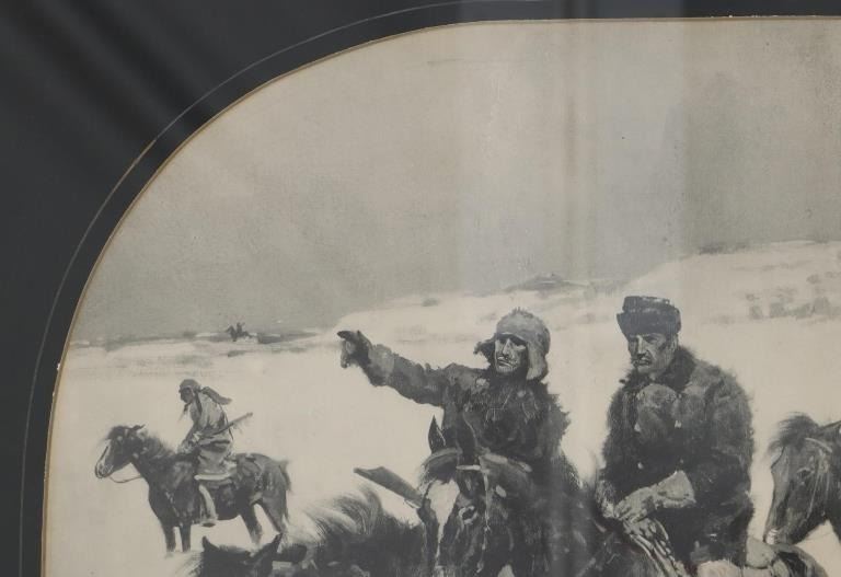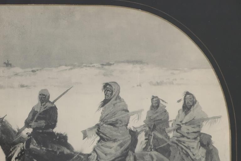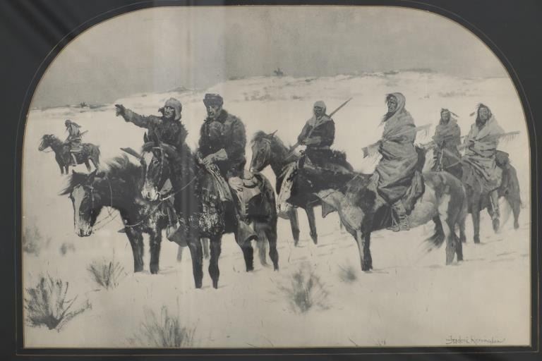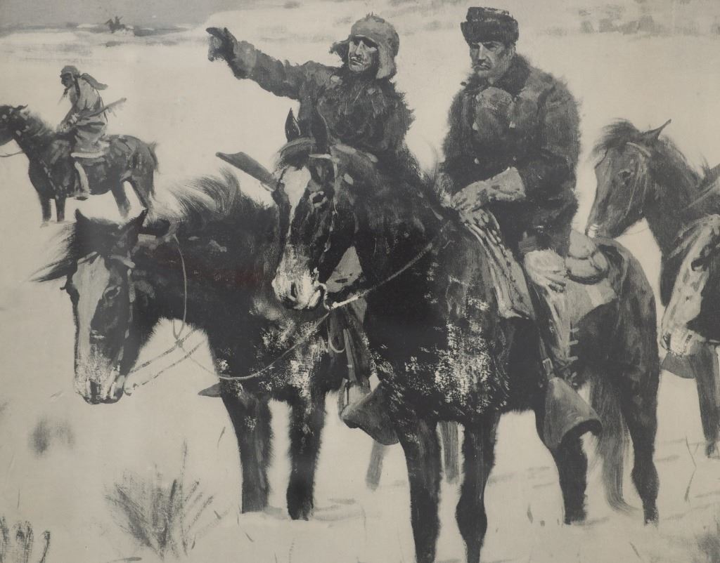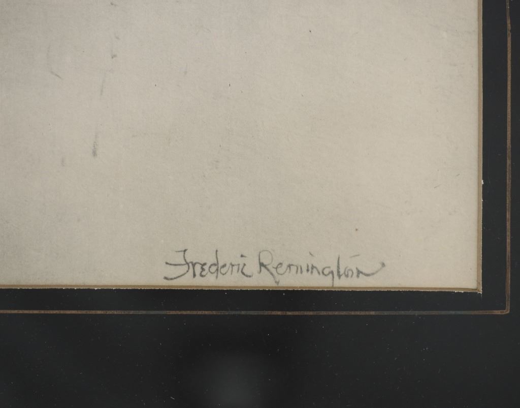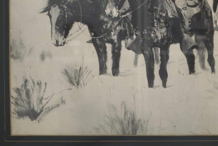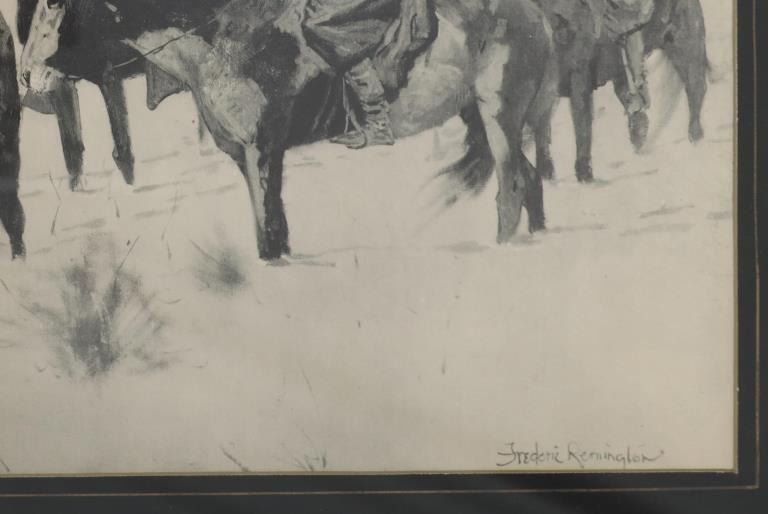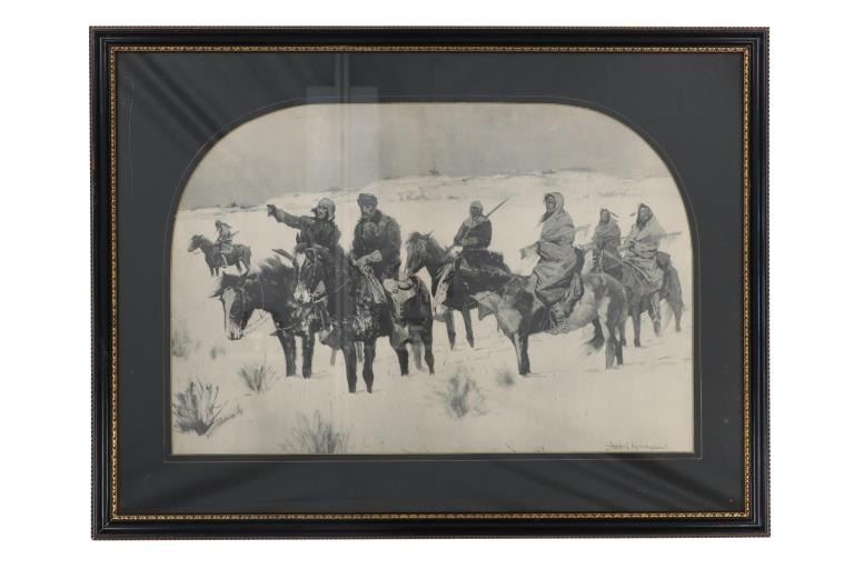 Featured in this lot is a Rare Frederic Remington Rotogravure Print of "Captain Baldwin Hunting the Hostile Camp", framed, circa 1897. This was made from an extremely rare set of 14 Remington black and white illustrations of the Indian Wars published by the Werner Company in 1897. The 14 were enlargements of the Remington illustrations contained in the book, "Personal Recollections and Observations of General Nelson A. Miles", 1896. These images were also contained in Remington's "Frontier Sketches", 1898. A similar rotogravure is part of the Amon G. Carter Collection of the Amon Carter Museum of American Art, Fort Worth, Texas. Remington is arguably one of the most influential Western artists who ever lived. Frederic Sackrider Remington (1861-1909) was an American painter, illustrator, sculptor, and writer who specialized in the genre of Western American Art. His works are known for depicting the Western United States in the last quarter of the 19th century and featuring such images as cowboys, Native American Indians, and the US Cavalry. This rotogravure is in amazingly well preserved condition, no marring is observed to the rotogravure. Mounted in a black stained wood gold gilt edge and gold gilt dentil molding matted glass frame, scuffing exhibited to frame edges, no other obvious marring noted. Visible art measures 22"L x 15"W, and the frame is 28.75"L x 21.5"W x .75"D approximately.