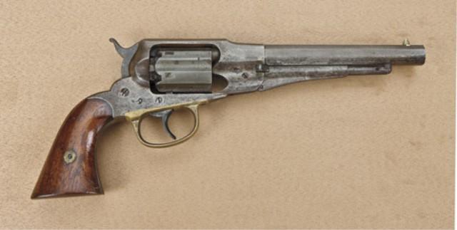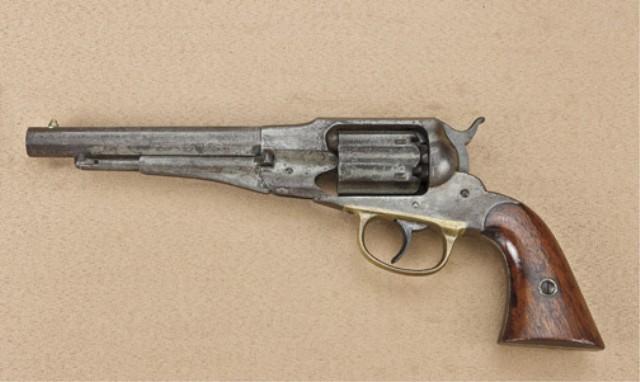 Remington Ryder double-action New Model belt revolver, .36 caliber, 6-1/2” barrel, fluted cylinder, grey patina finish, varnish wood grips, serial #98. Refer Flayderman 5E-026. The revolver remains in good to very good condition showing a light grey to brown patina finish, some scattered light to moderate erosion and surface pitting, with good edges and good barrel address. The grips are good to very good, just normal aging, the German silver type cone front sight is retained, action good, interior very good. A scarce Remington of which a few hundred were produced. Est: $900 - $1,800