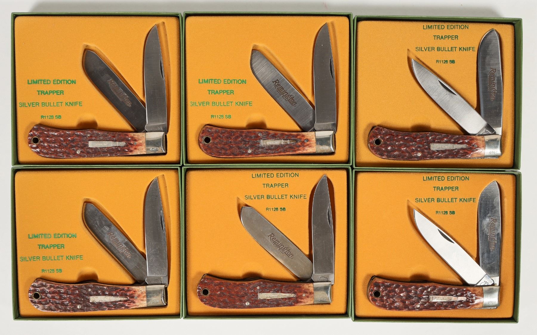 This is a brick of Remington Silver Bullet Trapper model knives model R1128SB 1 of 5000. Serial Numbers are: 0703, 0704, 0706,0707, 0708, 1261. New in the boxes. Please photo for details.