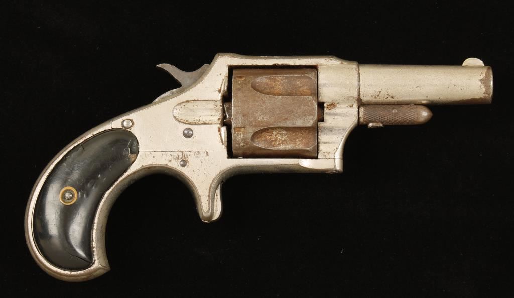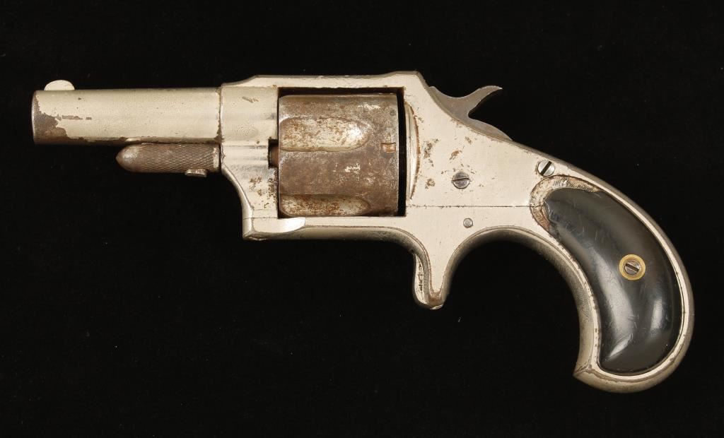 Nickel plated 5 shot spur trigger revolver. 2.5" barrel with fixed sights and black hard rubber grips. 65% finish remaining but turned to a dull silver with little finish on cylinder and cylinder pin. Left grip has large chip missing. Action does not function. Condition is poor. *Antique Firearm*
